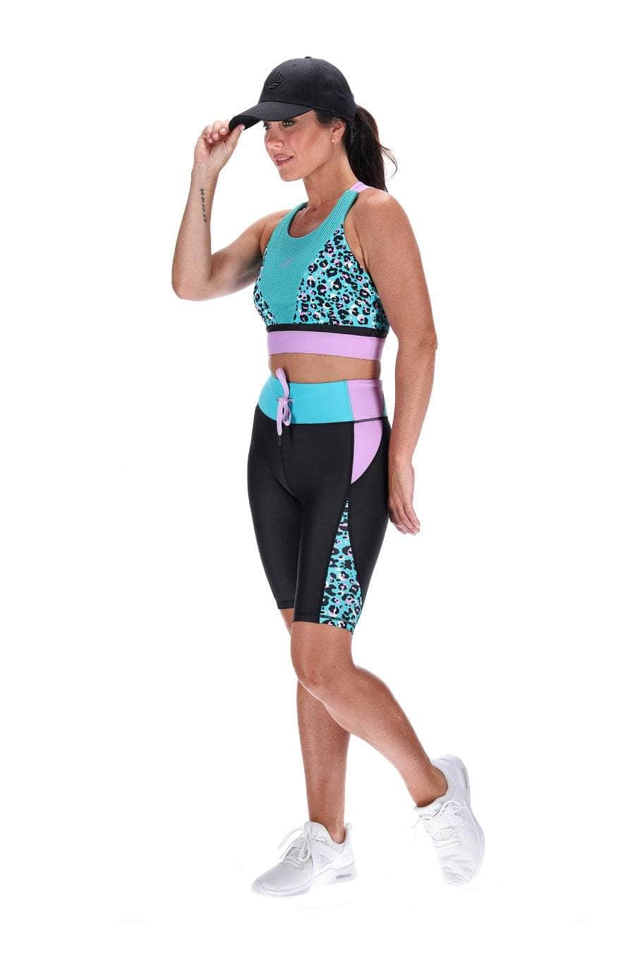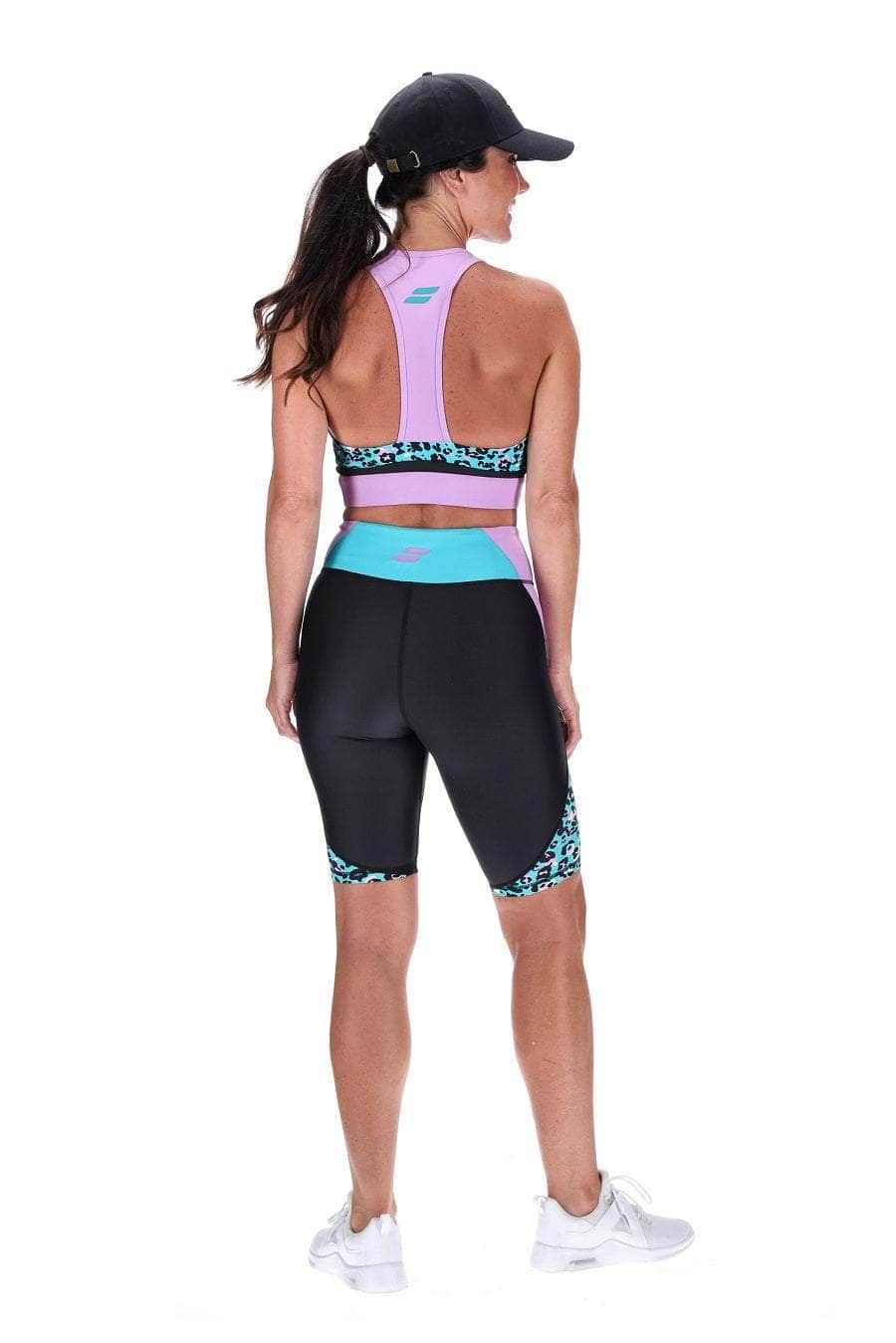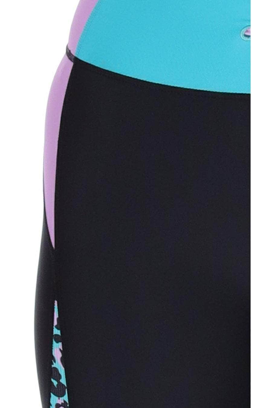 A black biker short with panels of teal and lilac.