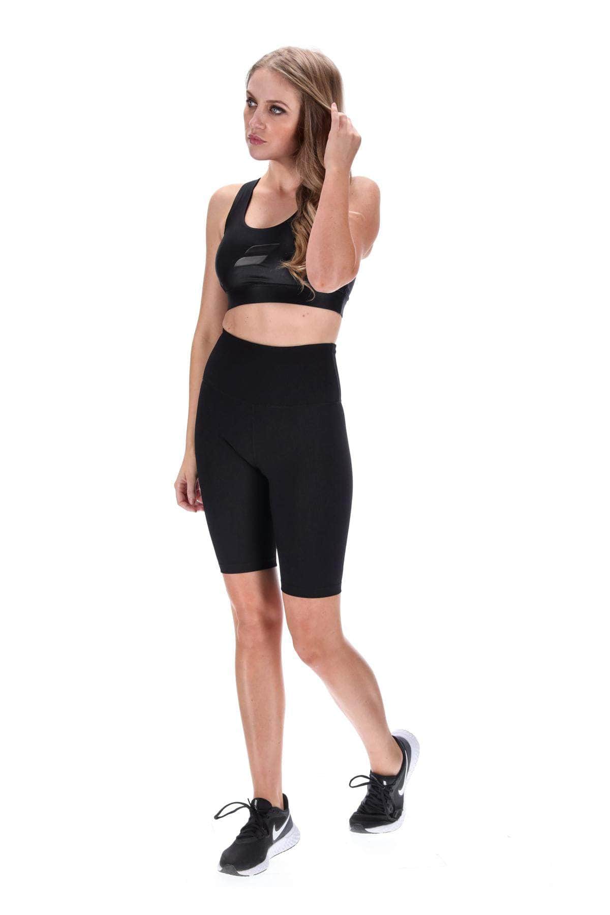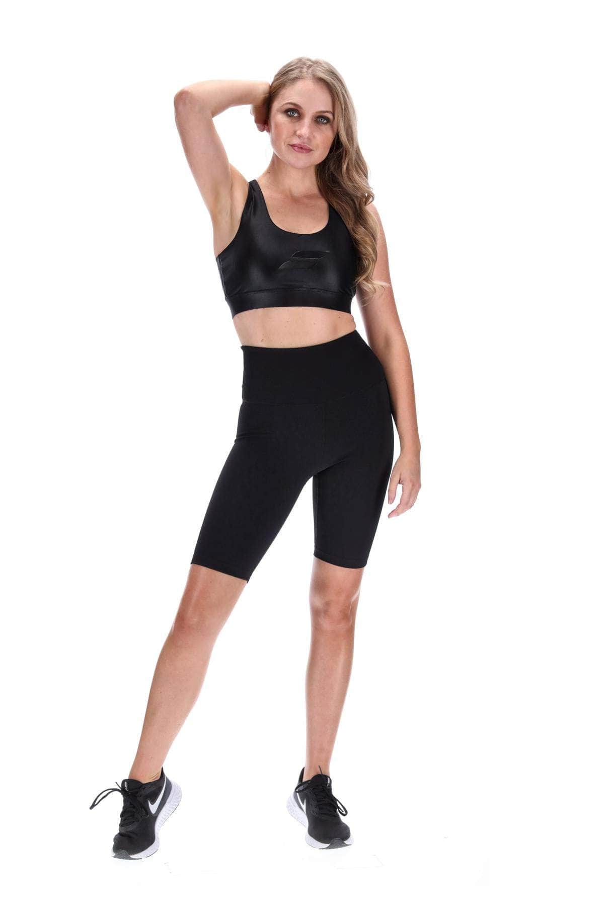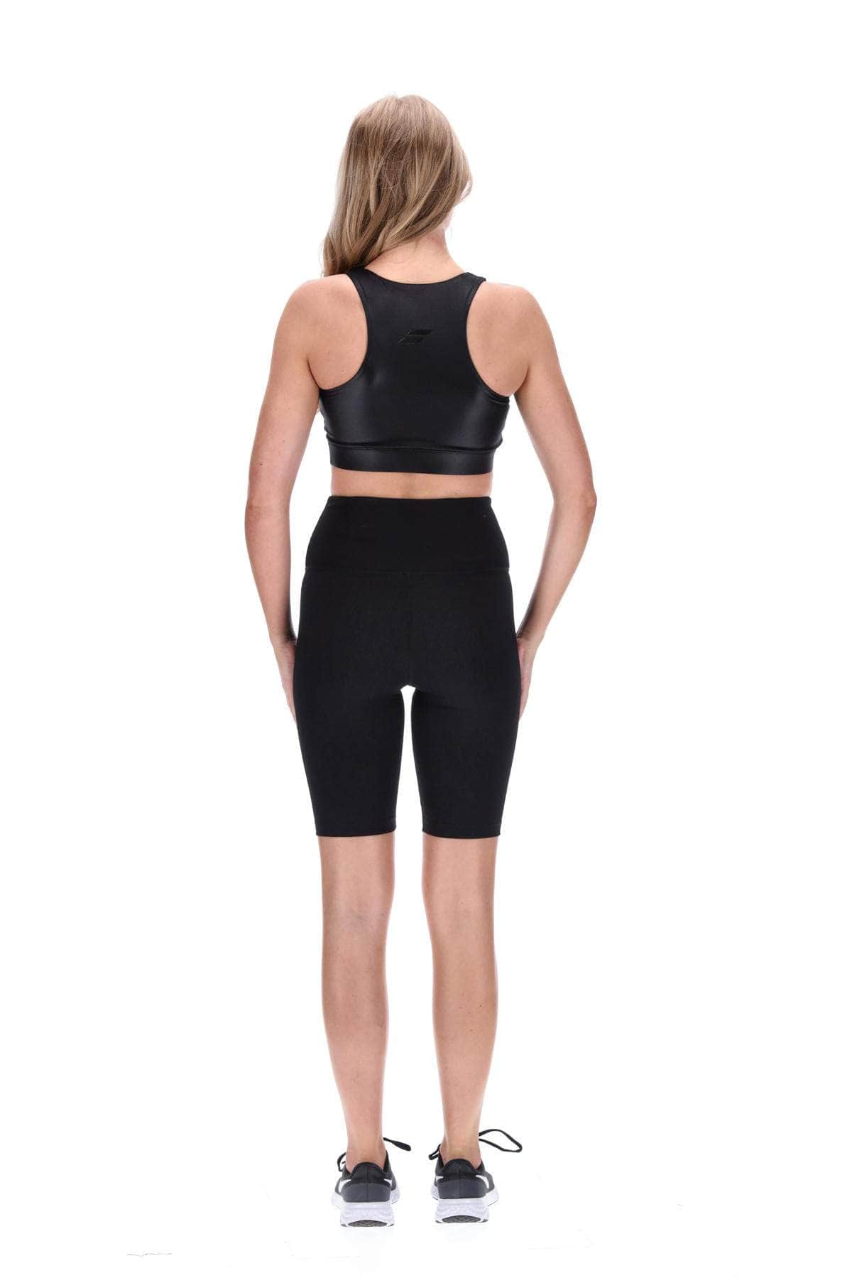A highwaisted black rib long biker short, with a back waistband phone pocket