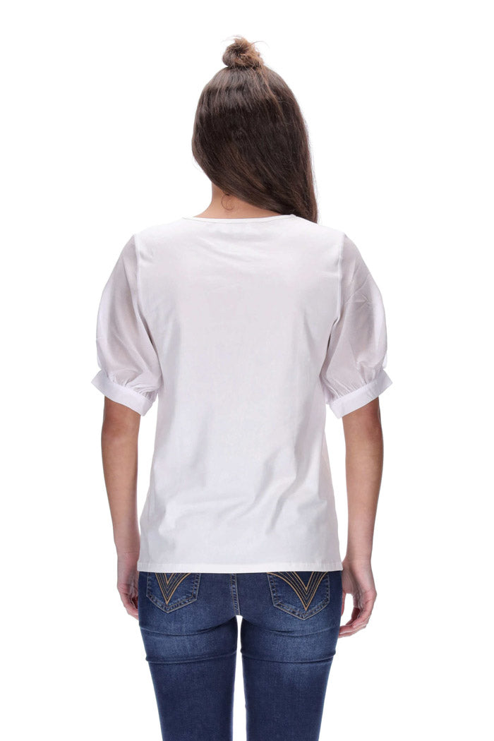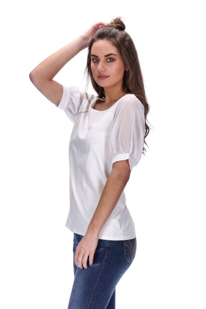 Features: Balloon chiffon sleeves with a cuff on the end, straight hemline and binded neckline