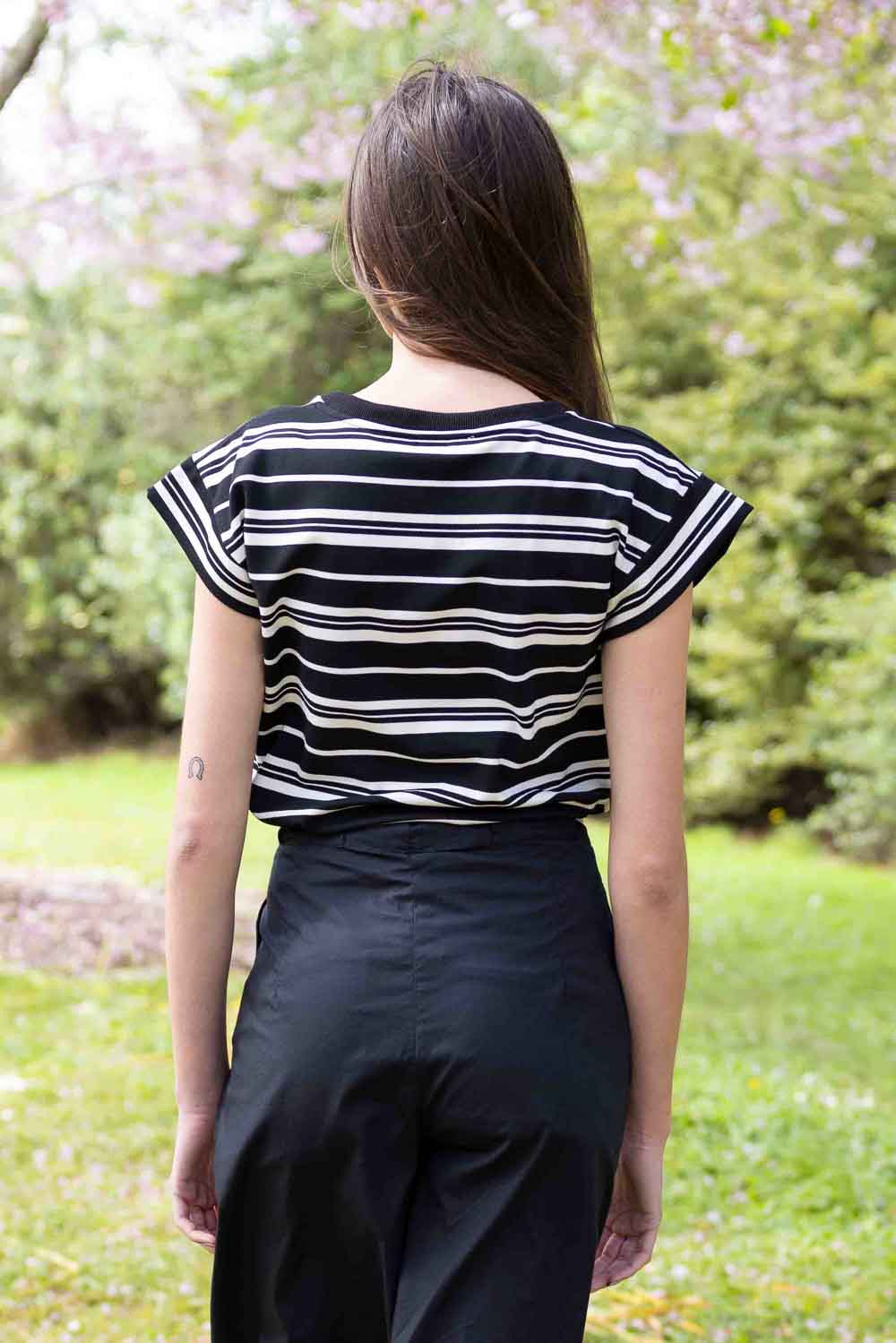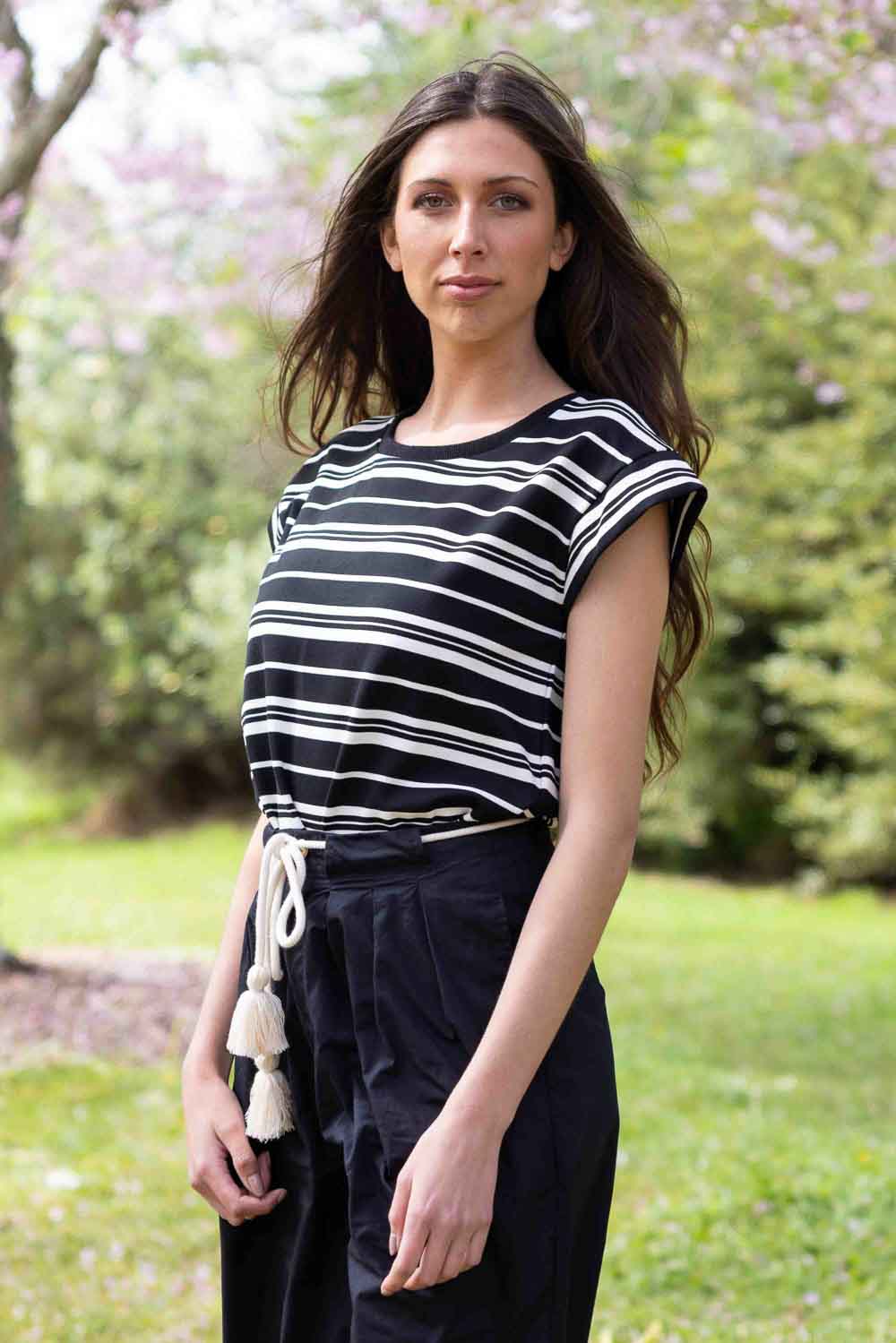 A black & white striped stretchy t-shirt.