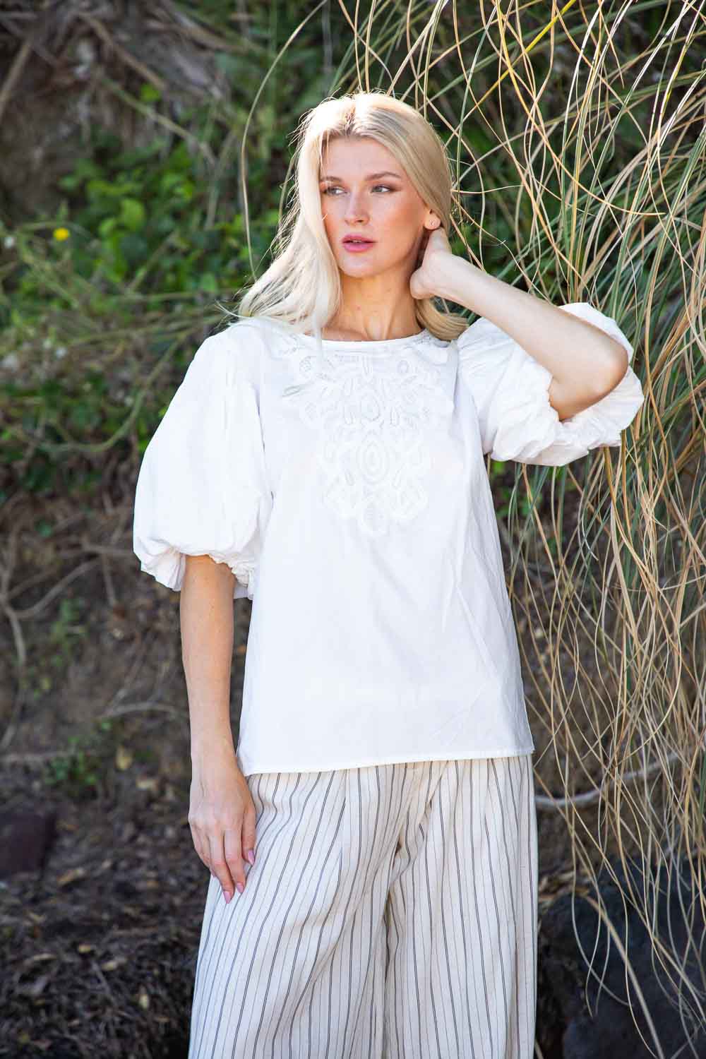 Petal Top Embroidered White Beige Cotton