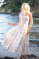 A white & beige floral print maxi dress with a smocked bodice.