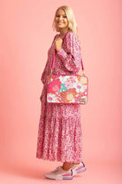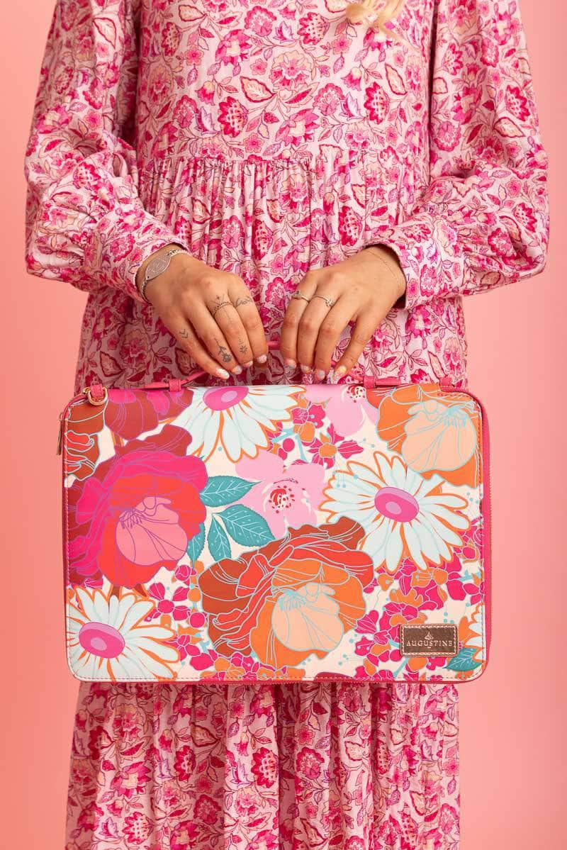 A gorgeous pink floral print laptop case, that fully unzips open to display internal storage compartments. Includes a long shoulder strap.