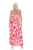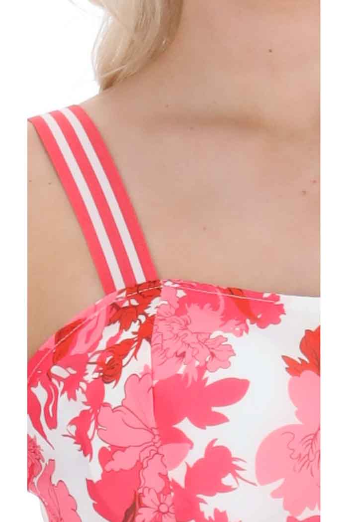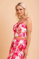 A hot pink floral print crop top.