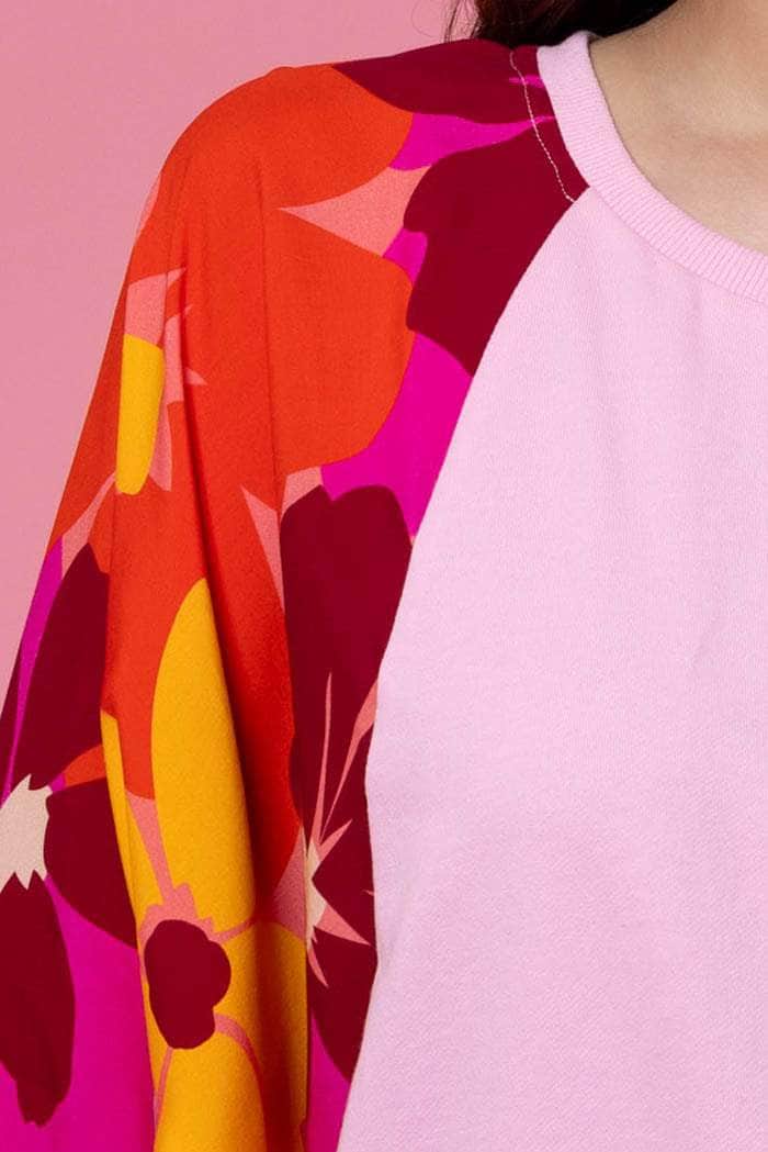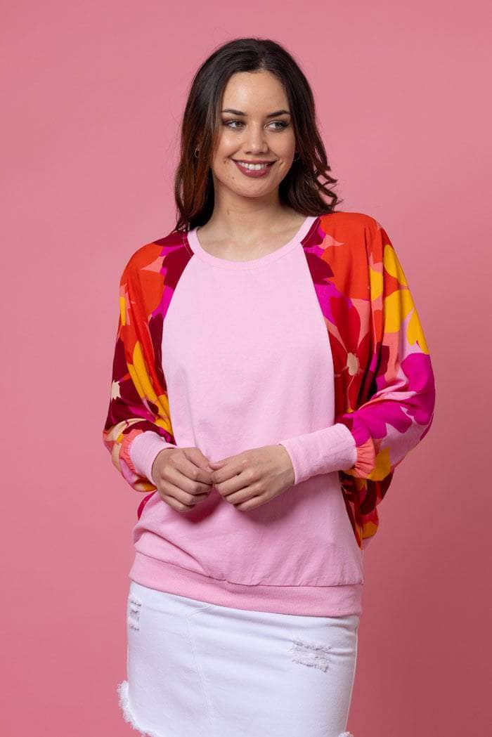 A pink lightweight sweater style with vibrant pink and orange sleeves.