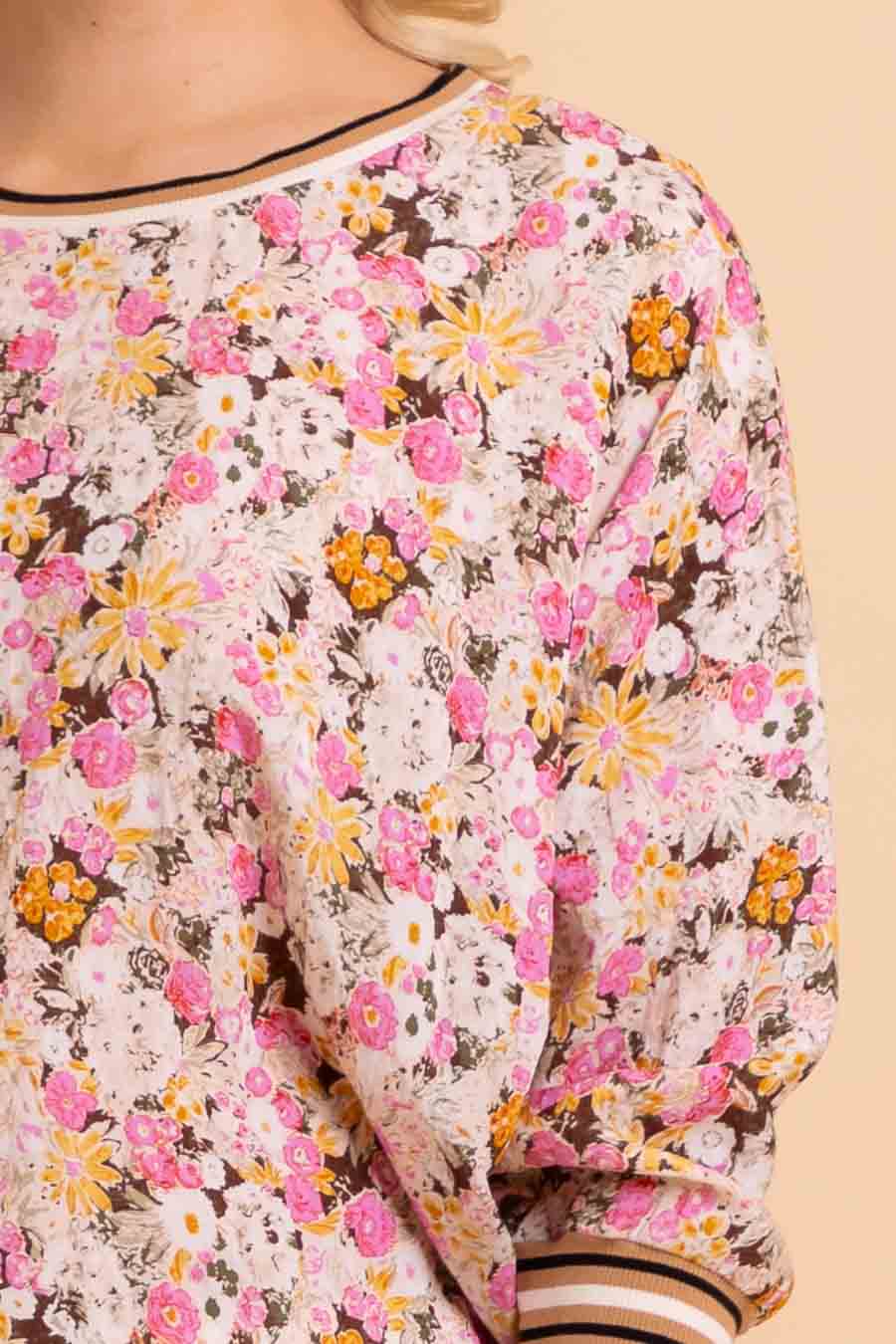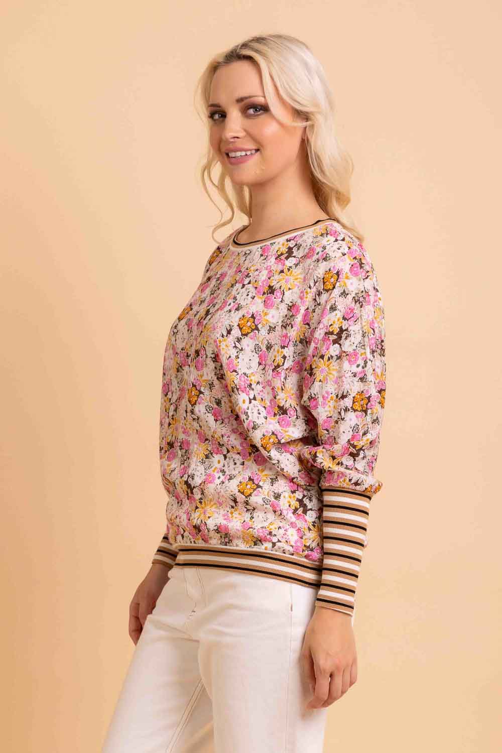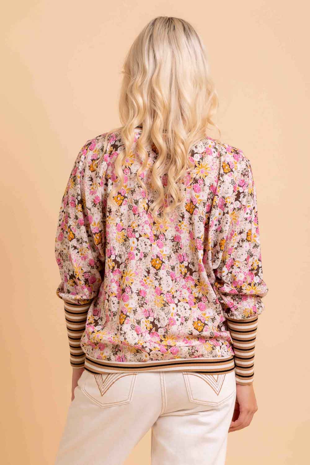 - Striped Tan/White/Black ribbing at neckline, cuffs, and hem