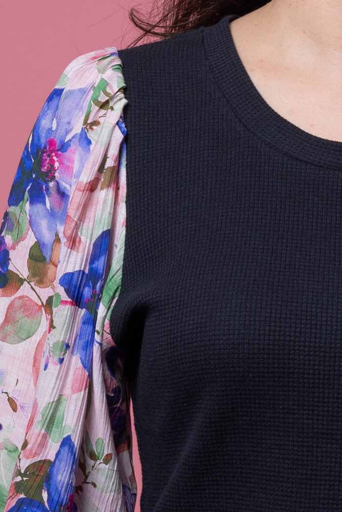 A soft floral printed sleeve with black ribbed bodice.