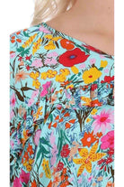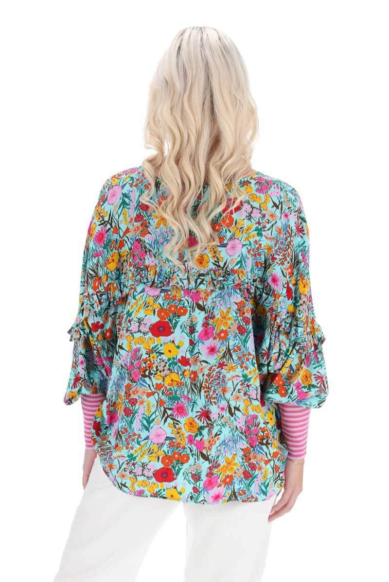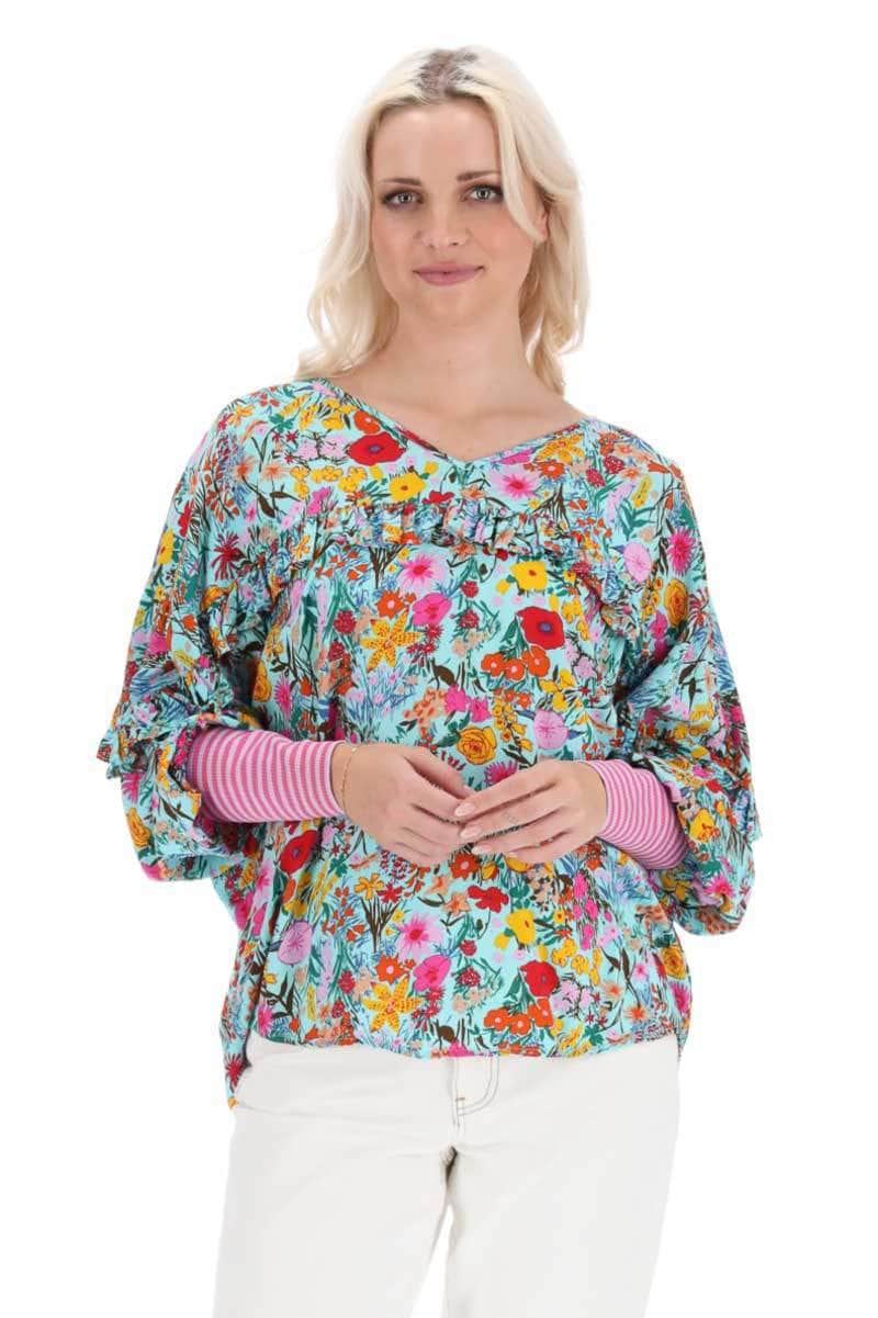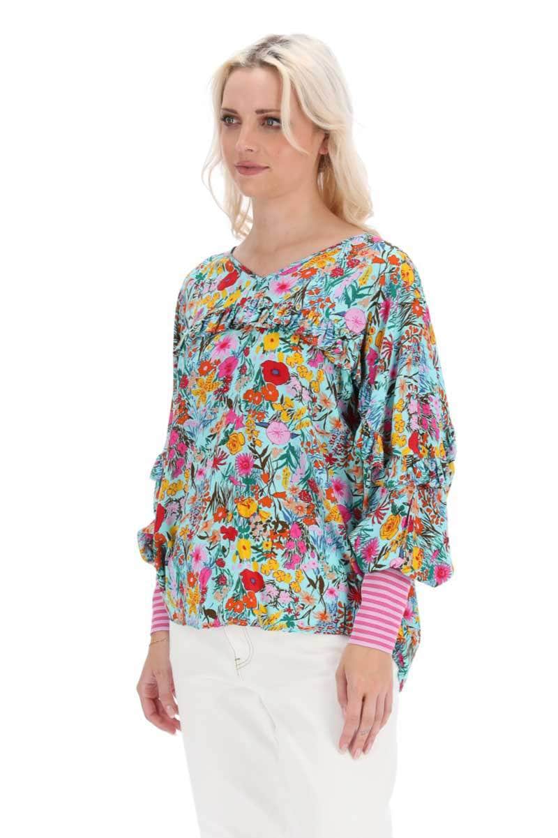 A frilly light blue floral print V neck top with ribbed cuffs.