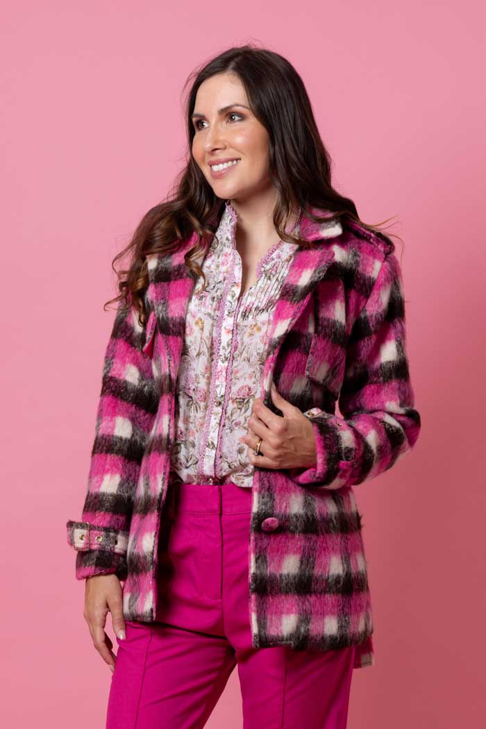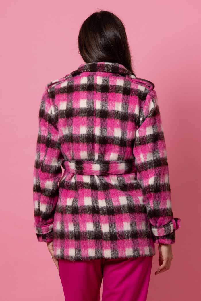 A pink, chocolate brown and white check short winter coat with waist tie.