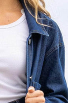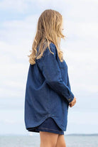 A dark blue denim oversized shirt.