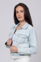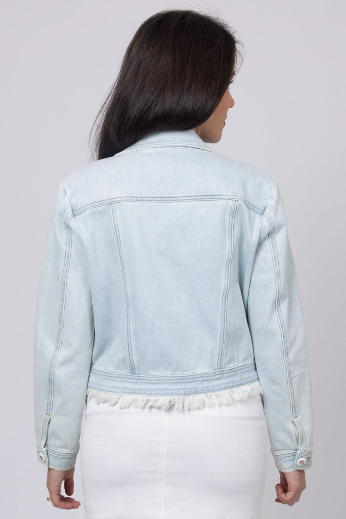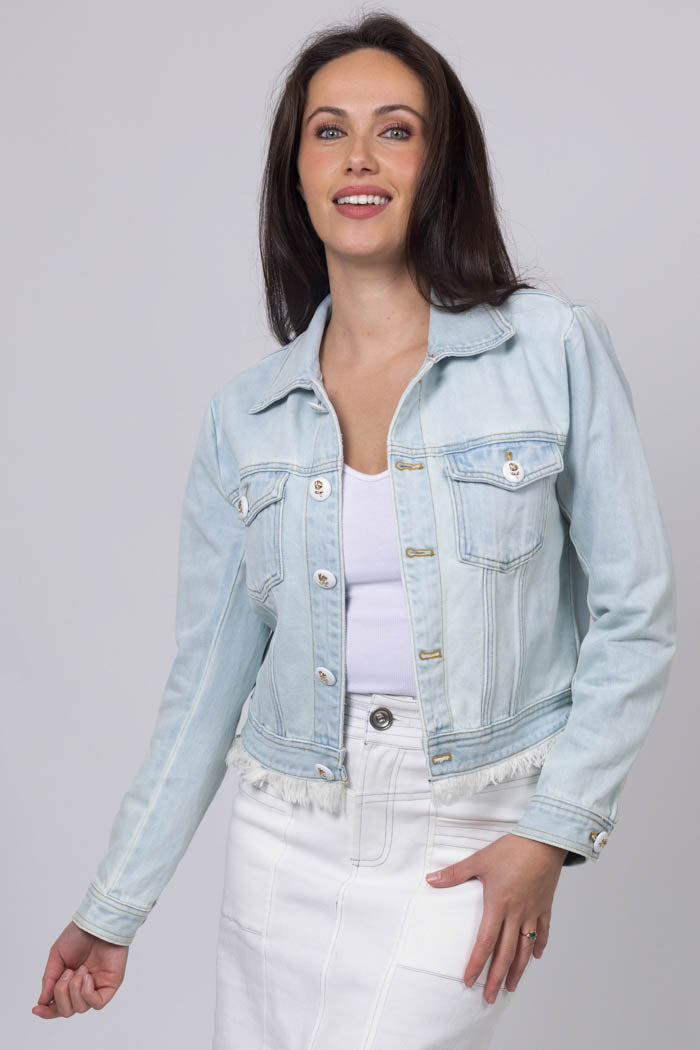 A soft light denim jacket with gorgeous white floral buttons and frayed bottom tassels.