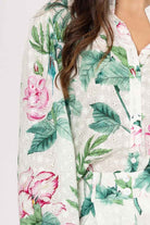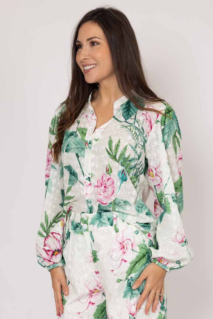 An embroidered white, pink, and green floral shirt perfect for warm or cool weather.