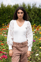 A soft ribbed cream blouse with embroidered sleeve.