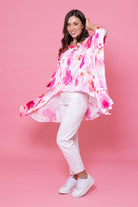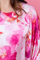 A satin pink floral print oversized top.
