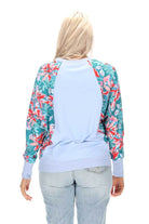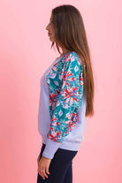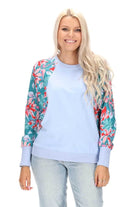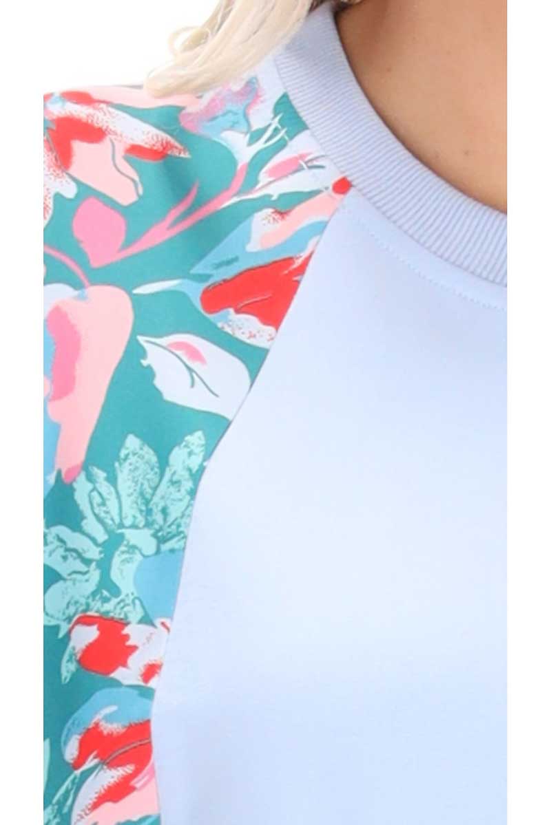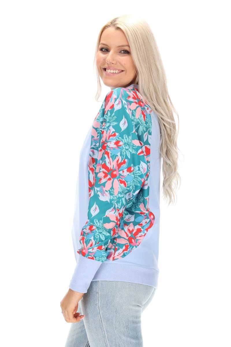 A light blue sweatshirt top with teal floral print sleeves.