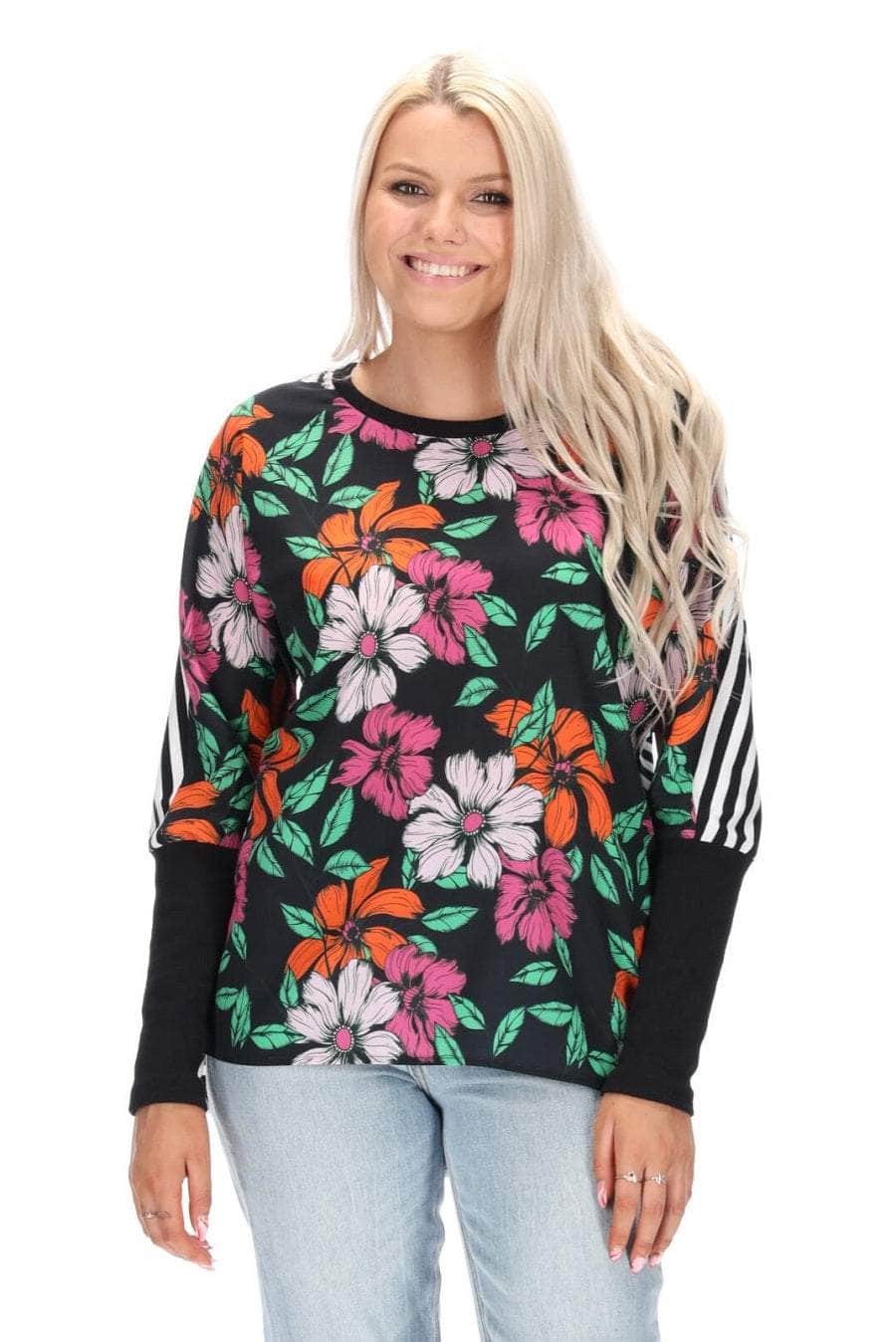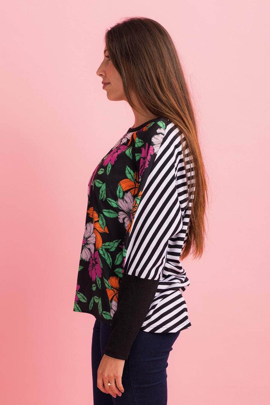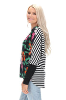 A blue & green abstract print top with a striped back.