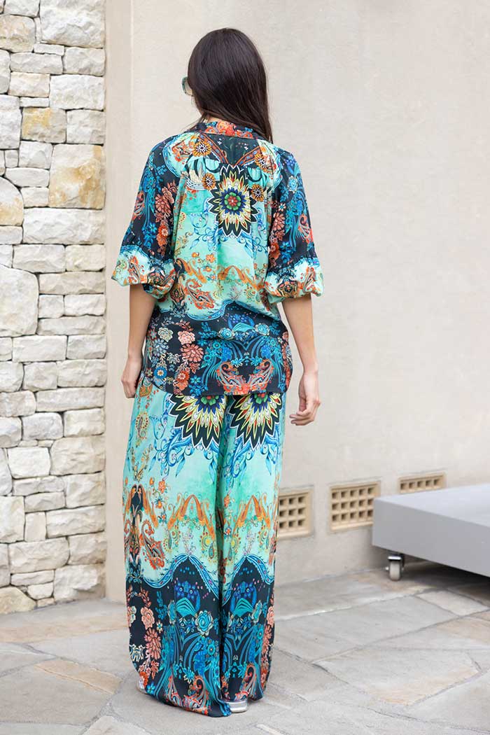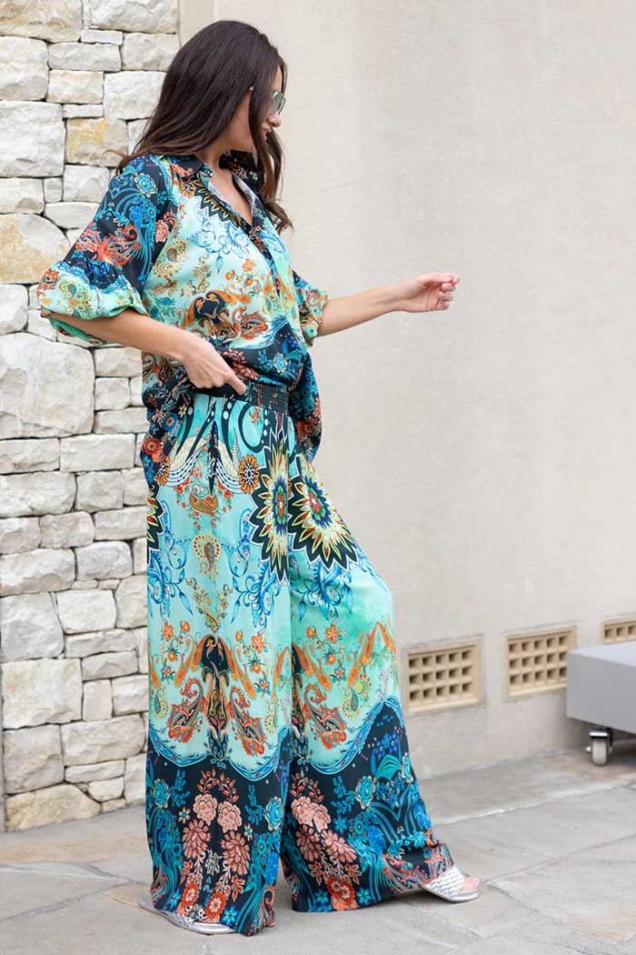 A bold green and blue print pant.
