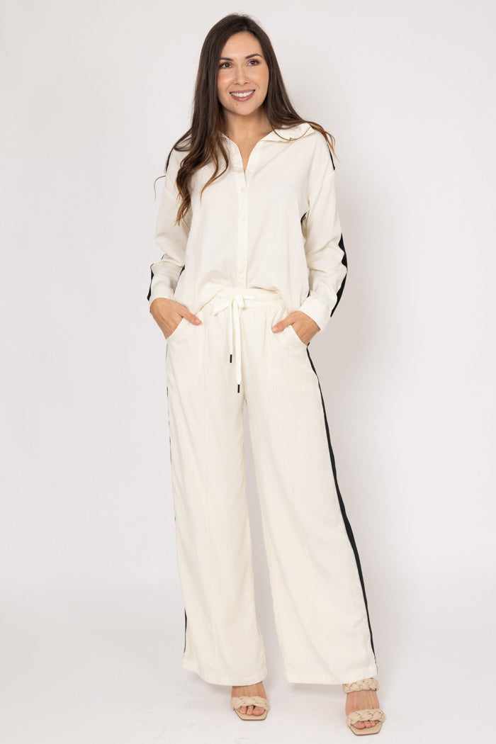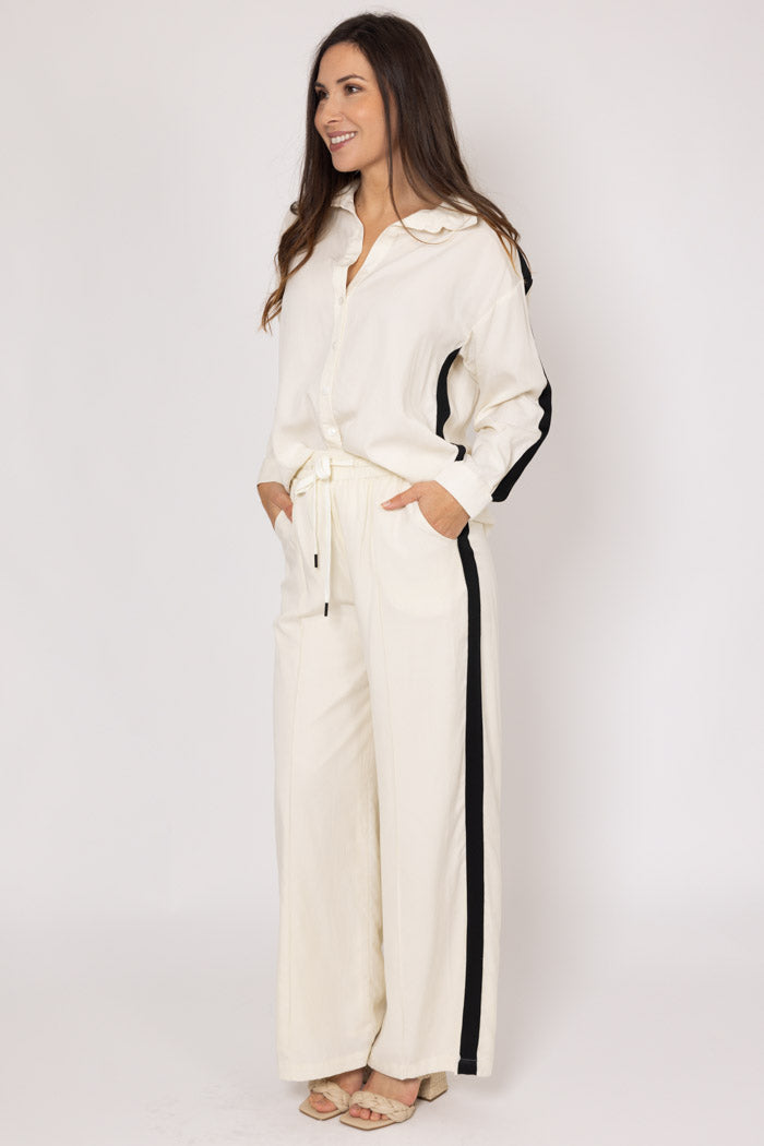 A soft cream pant with black stripe down the side.