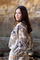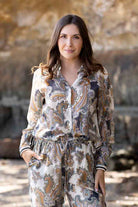 A soft paisley cream fabric shirt with a touch of black and white stripe detailing on the cuffs and collar.