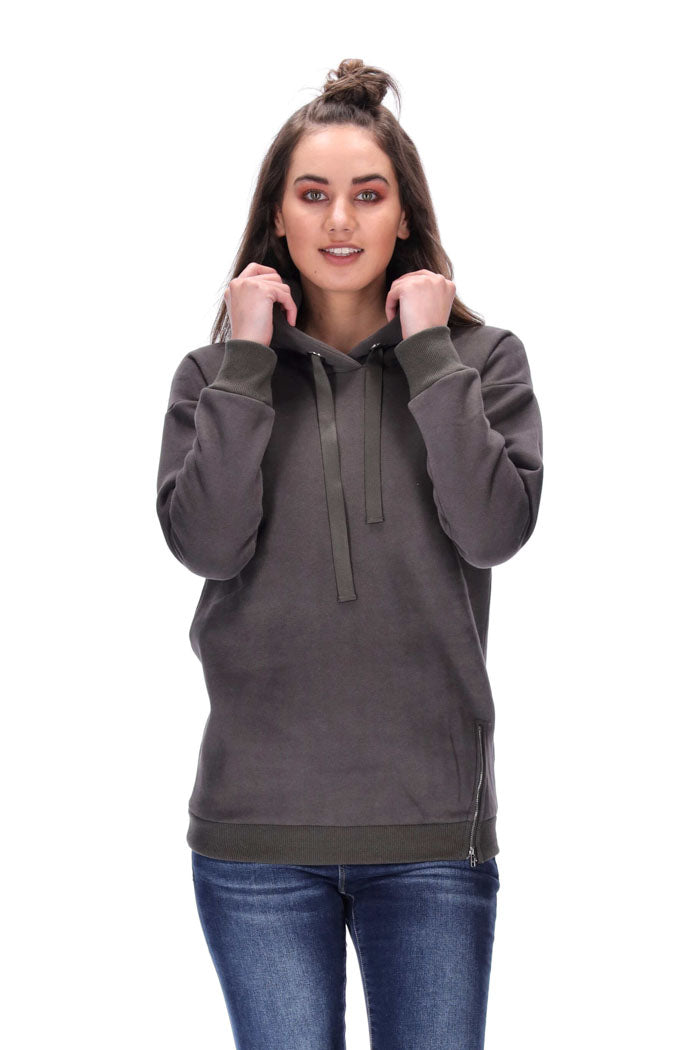 Features: Casual hoodie with a grosgrain hoodie drawstring, ribbing on the sleeves and hem and side zip detail in front.