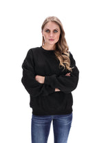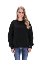 Features: Drop shoulder sweater with soft brushed backing, ribbed neckline, chunky cuffs and hemband.