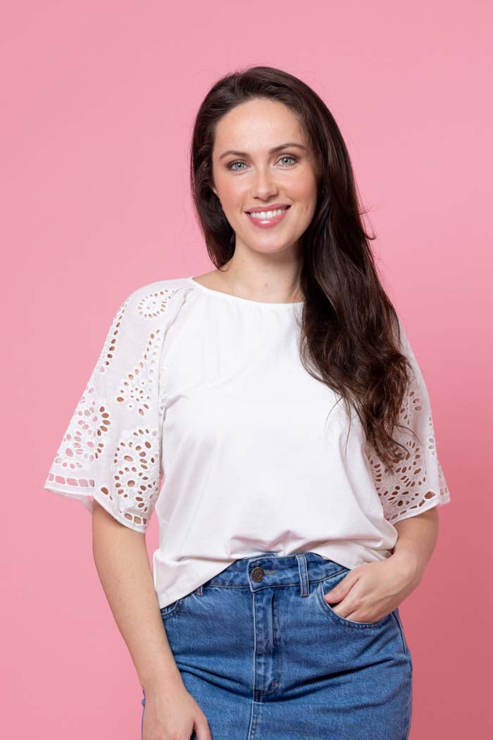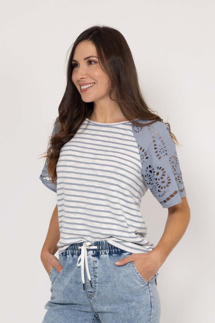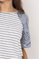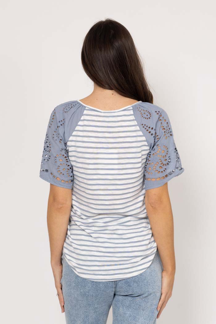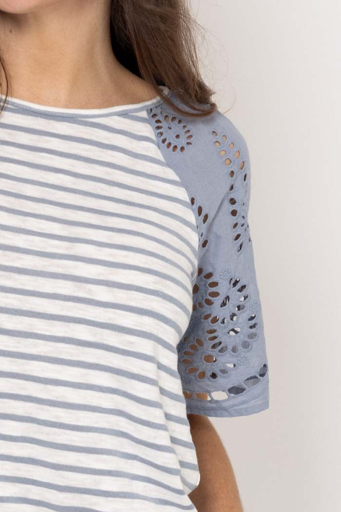 A soft blue fabric t-shirt with stripe detail through the bodice. Embroidered sleeve detail.