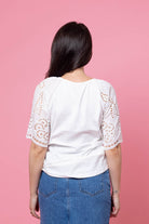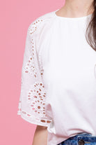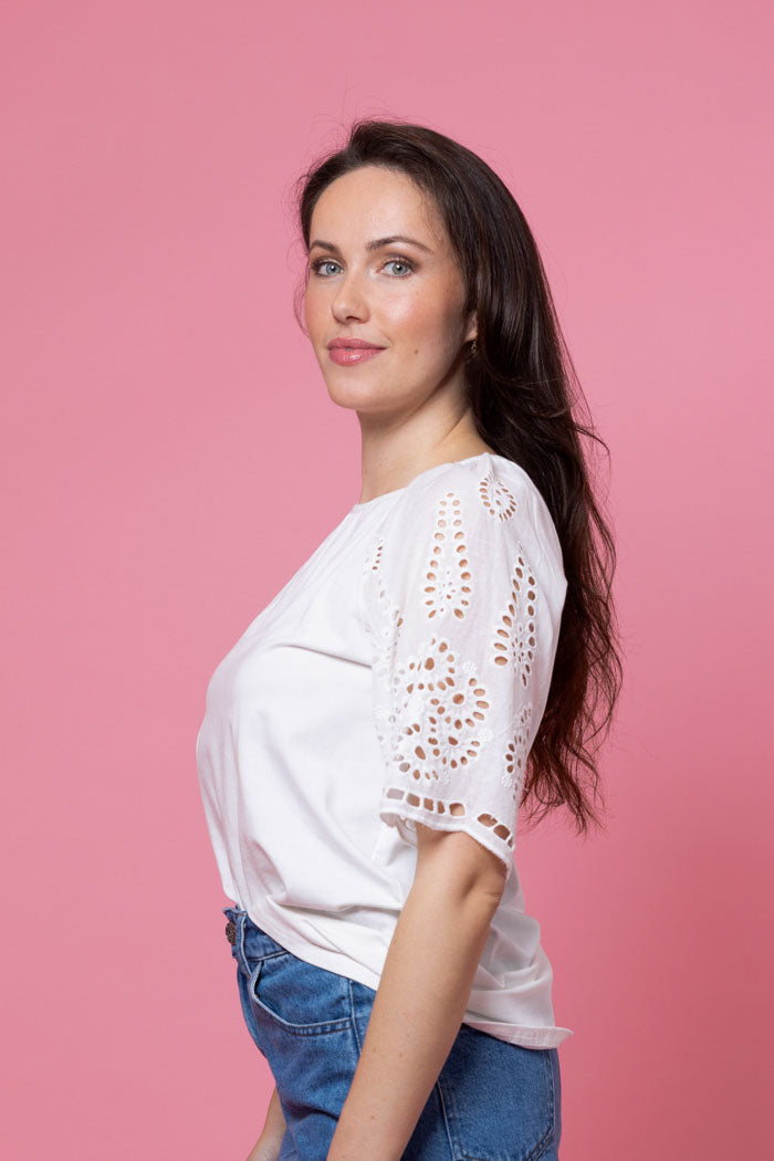 A soft white t-shirt with embroidered fabric sleeve to the elbow.