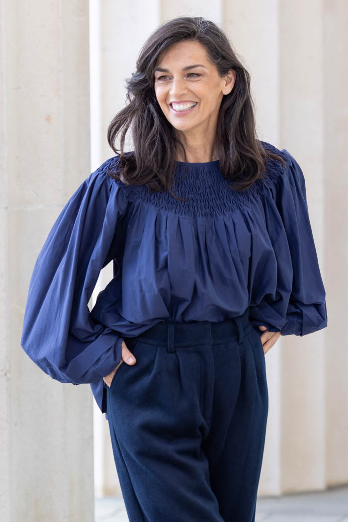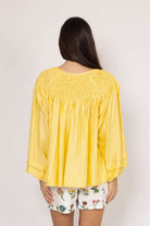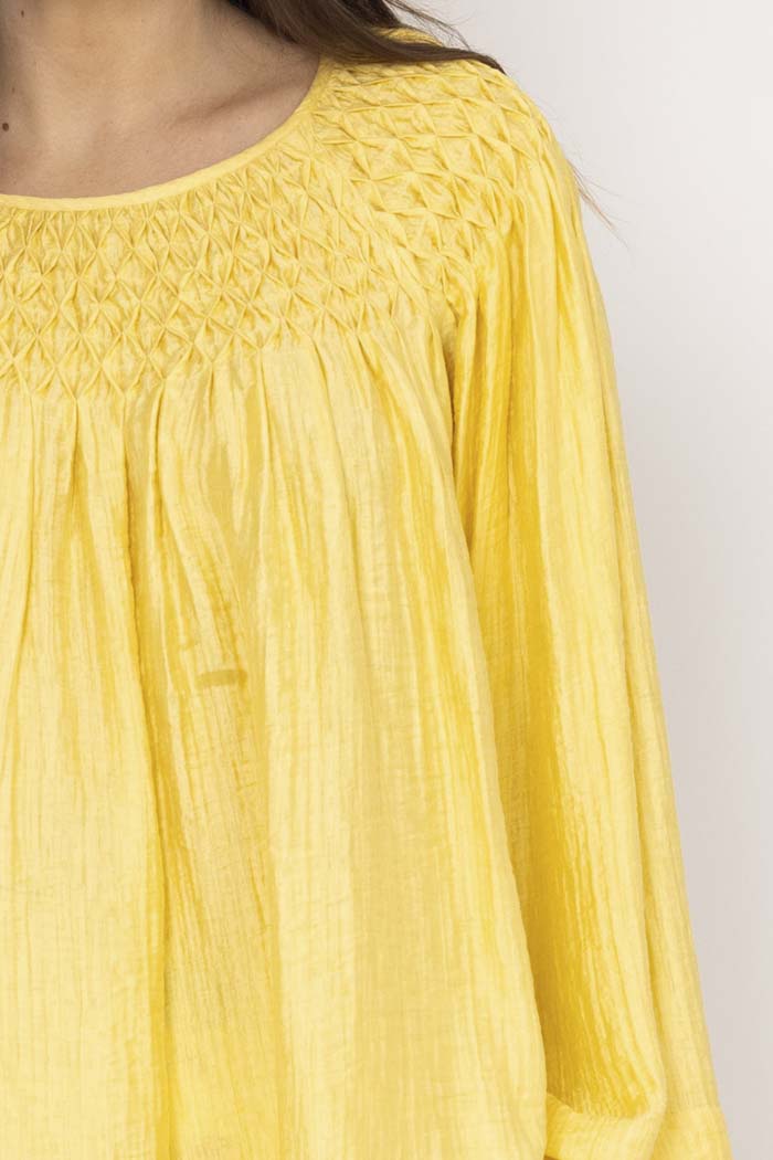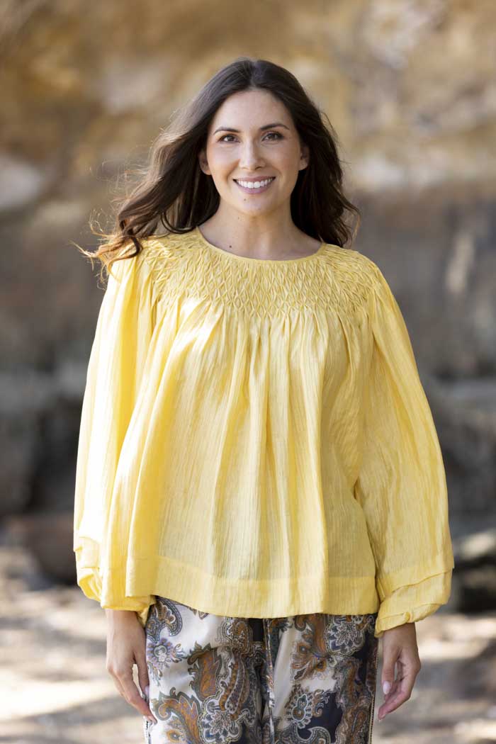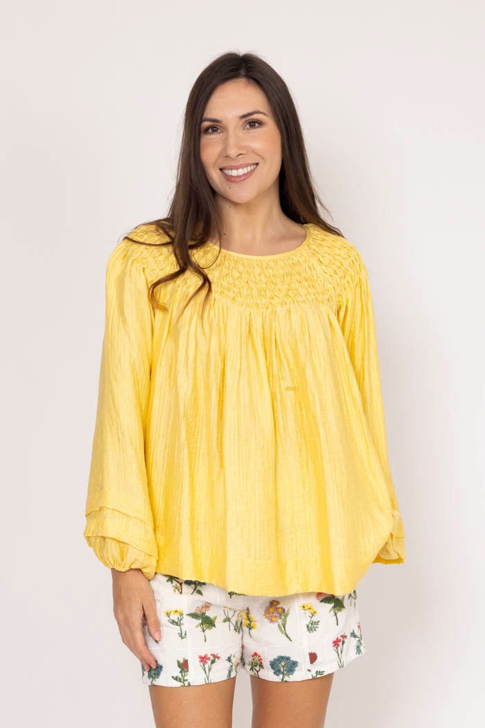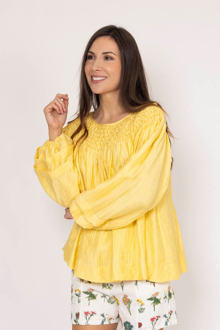 A butter yellow floaty blouse with shirred detail across the shoulders and a floaty bodice.