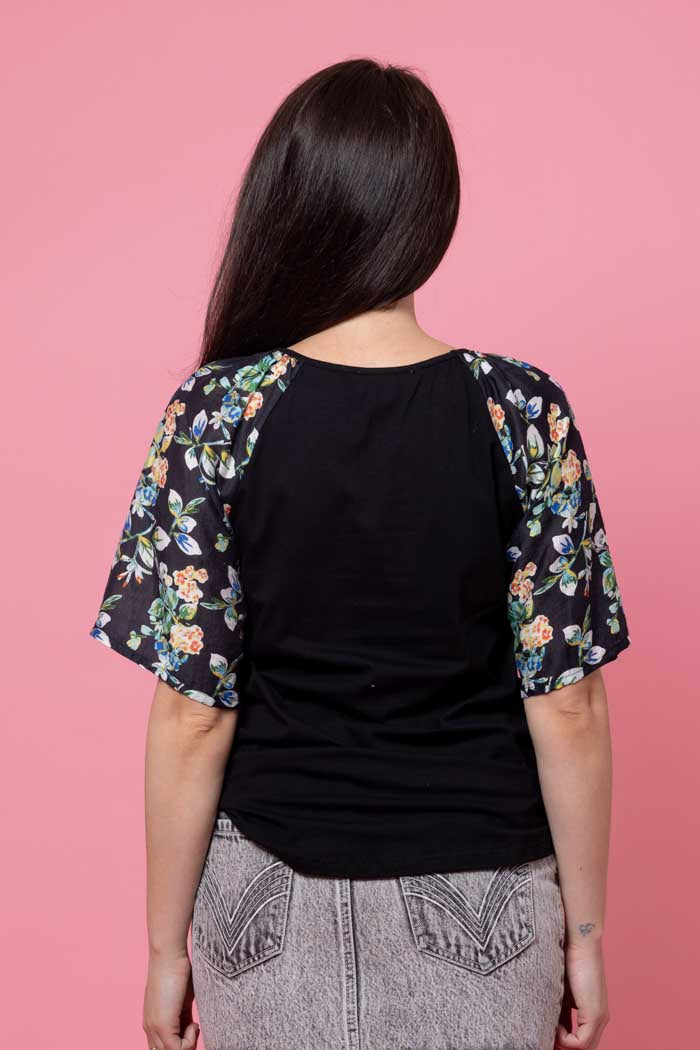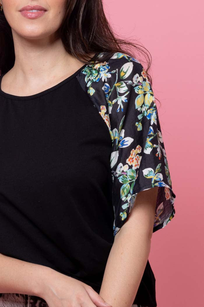 A soft black t-shirt bodice with a touch of black floral sleeve.
