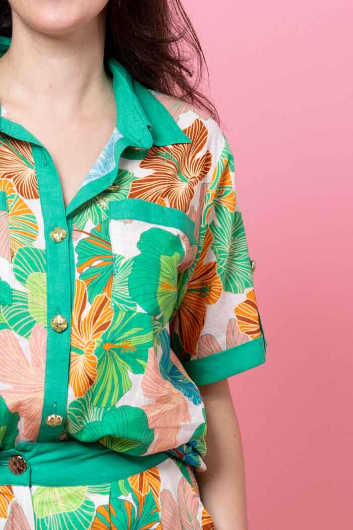 A green floral shirt with front pockets and bold floral.