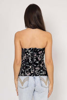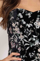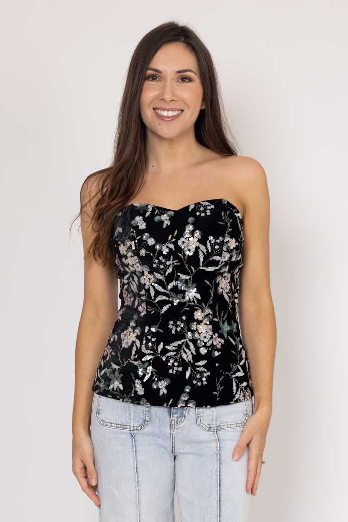 A sparkling sequin strapless bodice top with floral sequin detailing.
