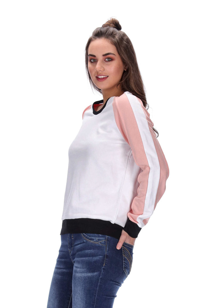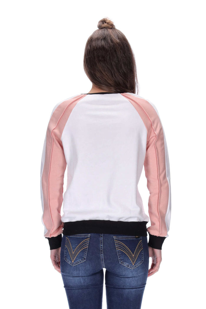 Features: Sweater with raglan seams, contrast sleeve panels, pintucks running down the sleeves and a ribbed black neckline, cuff and hem band