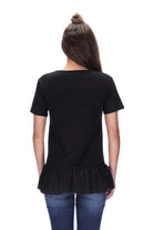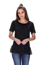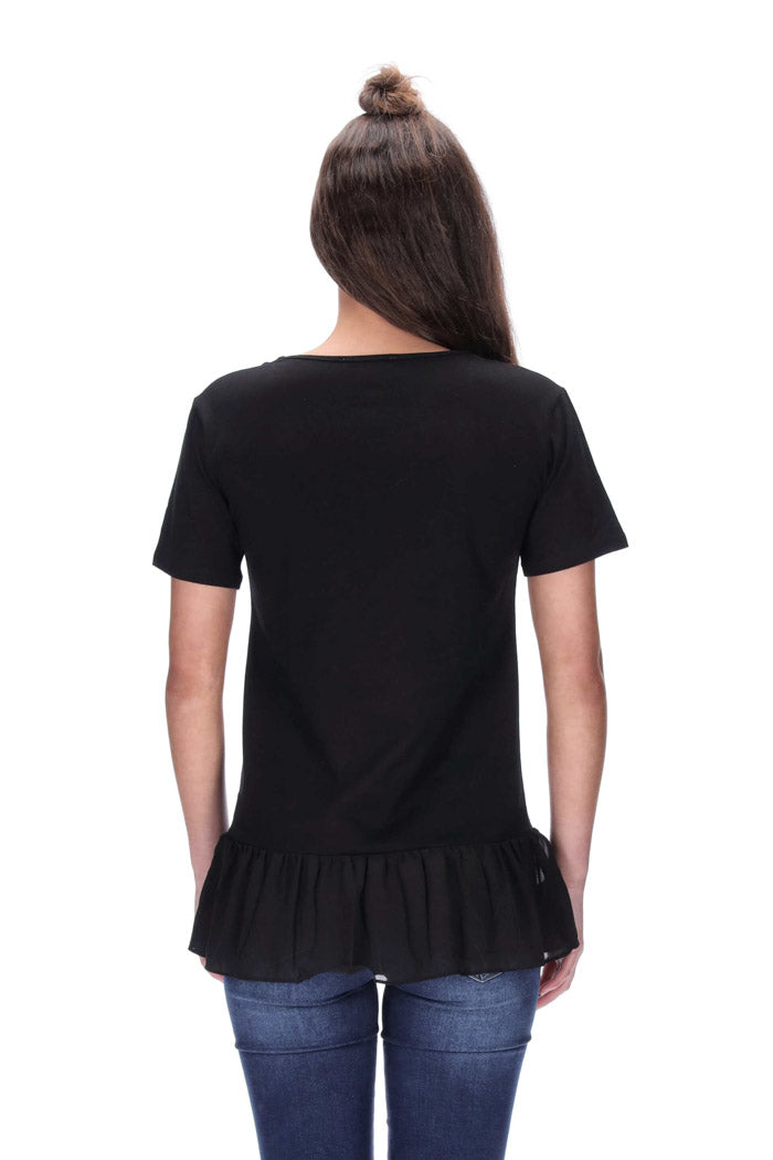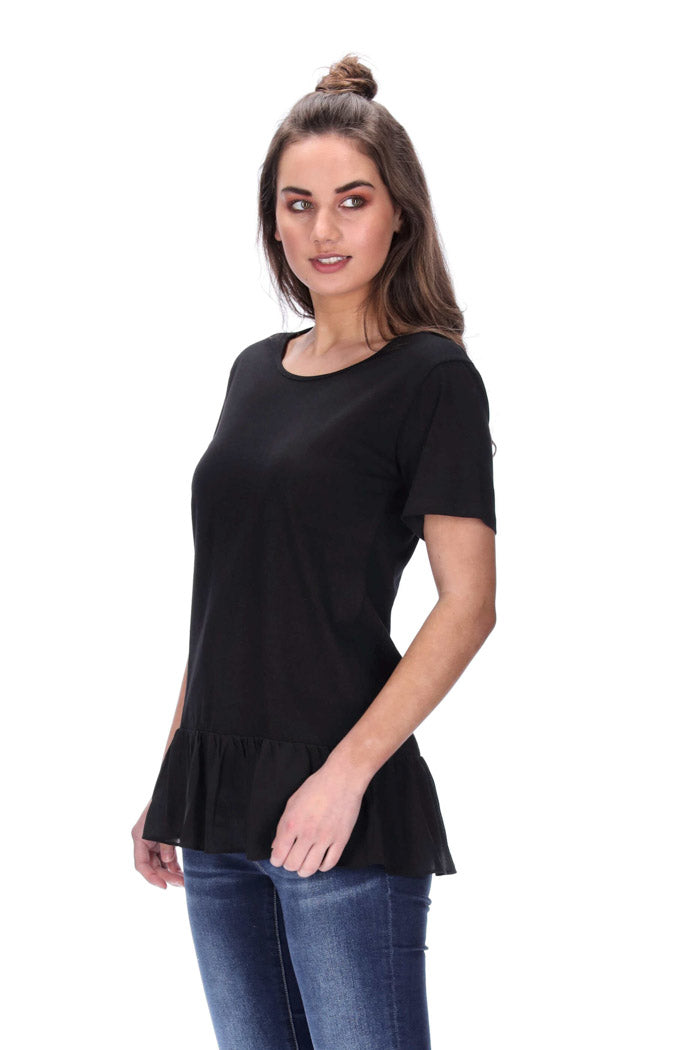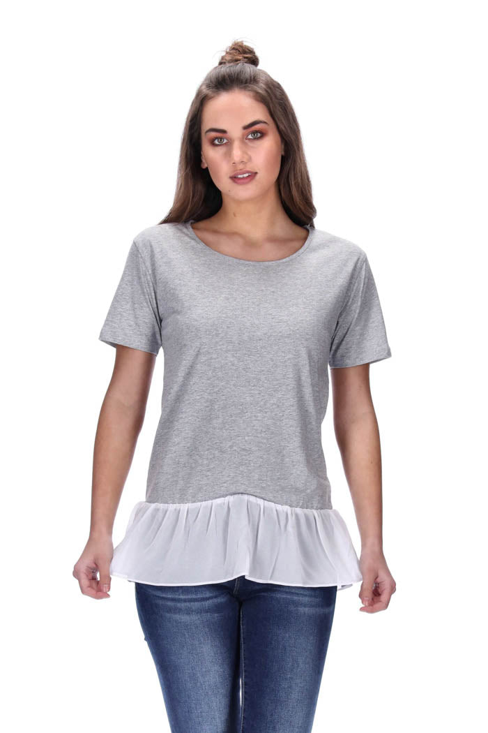 Features: Plain tee with gathered chiffon hem panel and straight hemline