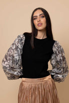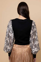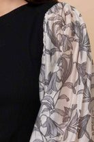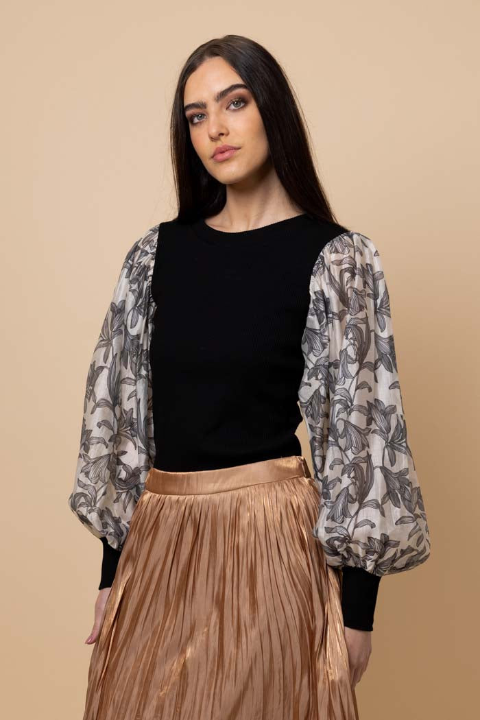 A black ribbed body with a black floral balloon sleeve detail.