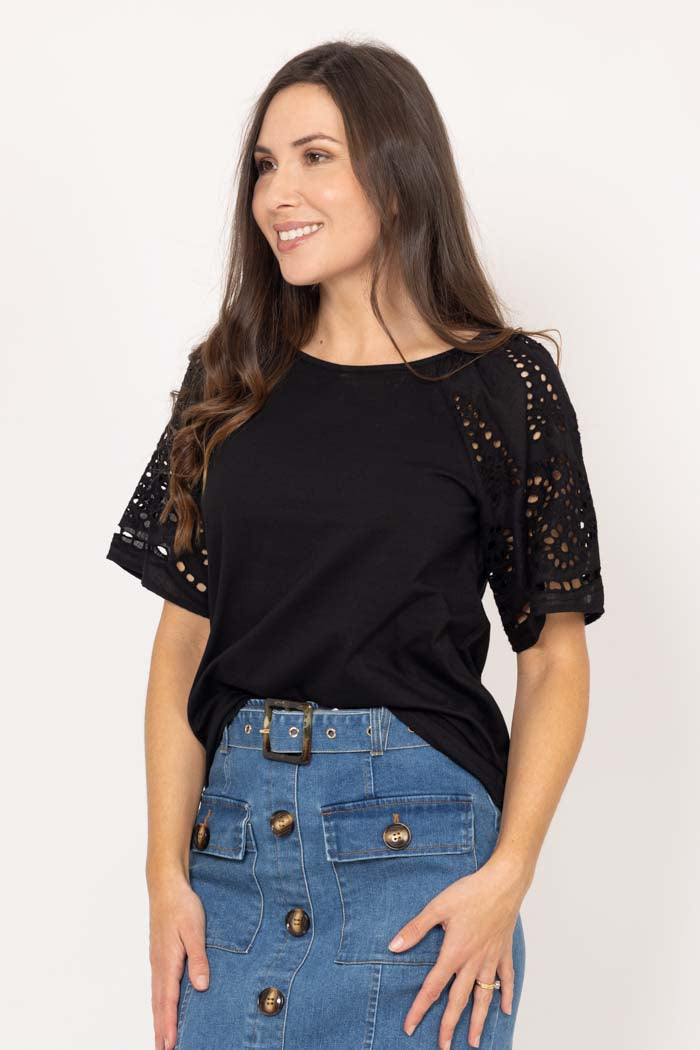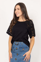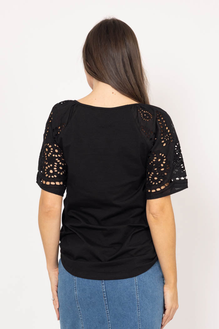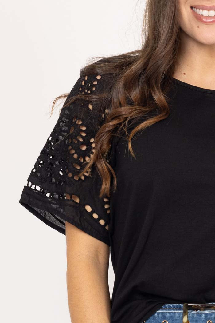 A soft black t-shirt with embroidered fabric sleeve to the elbow.