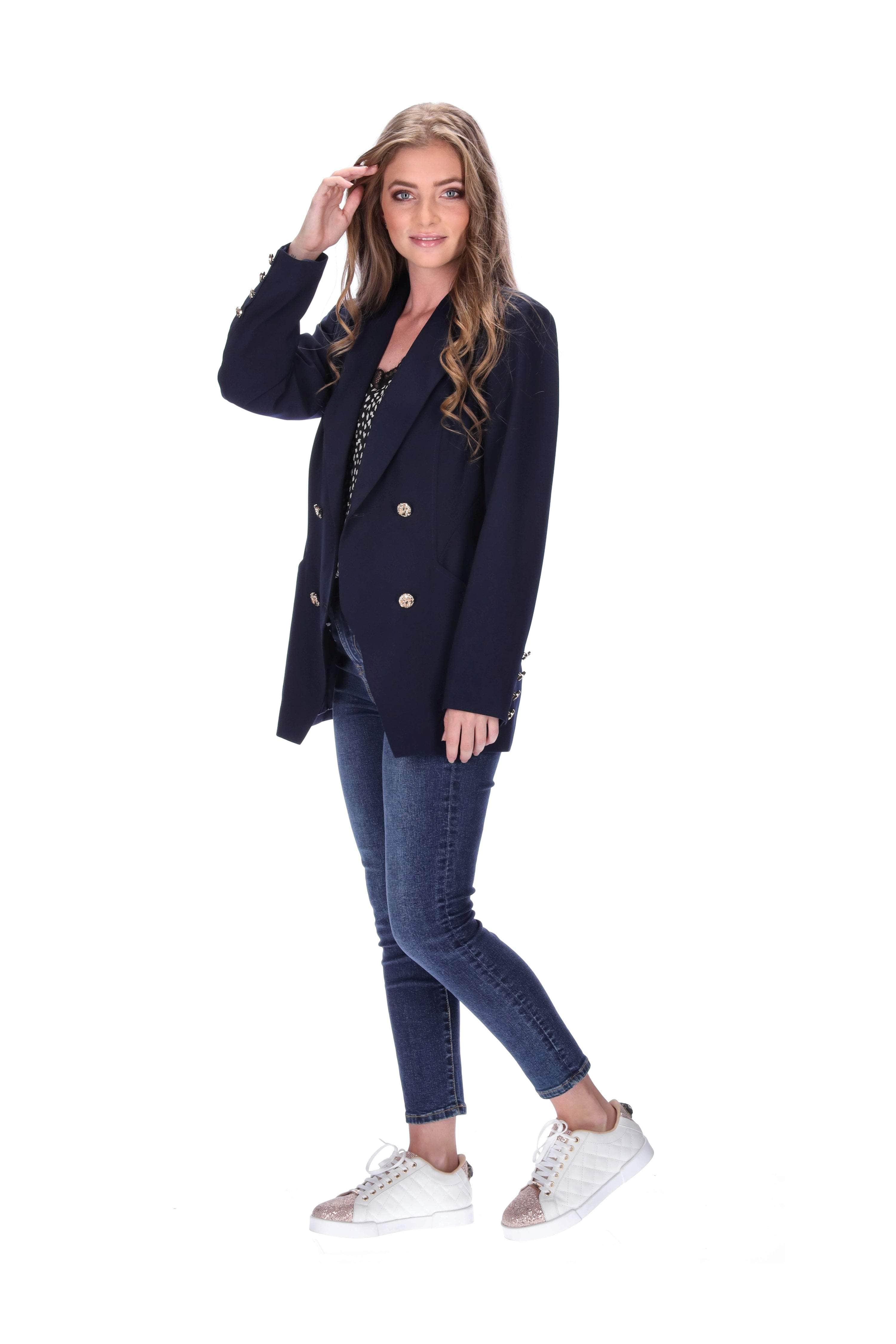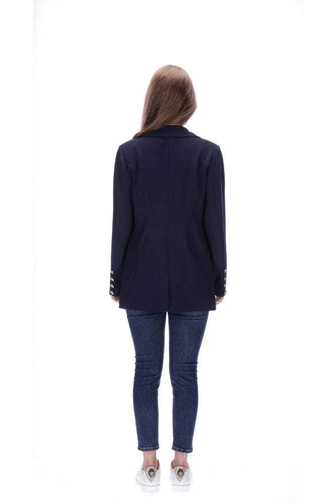 Beautiful navy suit jacket with lovely panel, stitch detailing through the body, fancy gold metal buttons at front body and sleeve hems. Jacket also has pockets at front extending from panel lines and has soft shoulder pads for structure.
