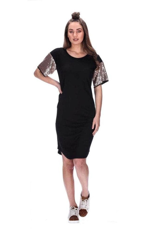 Features: Dropped shoulders, sequined sleeves, curved hem