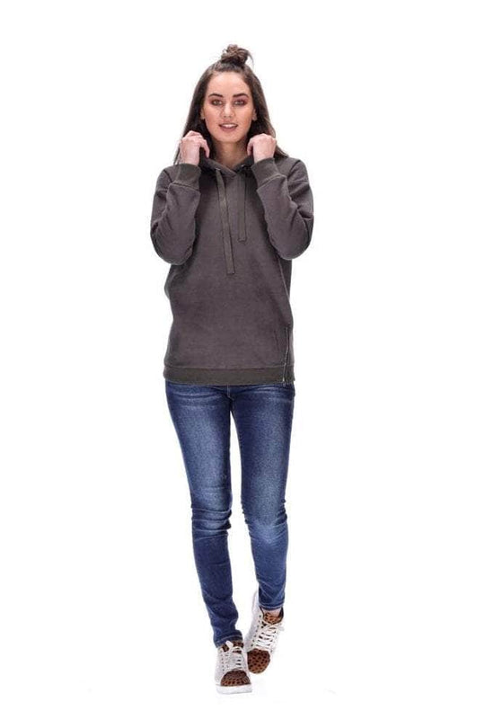 Features: Casual hoodie with a grosgrain hoodie drawstring, ribbing on the sleeves and hem and side zip detail in front.