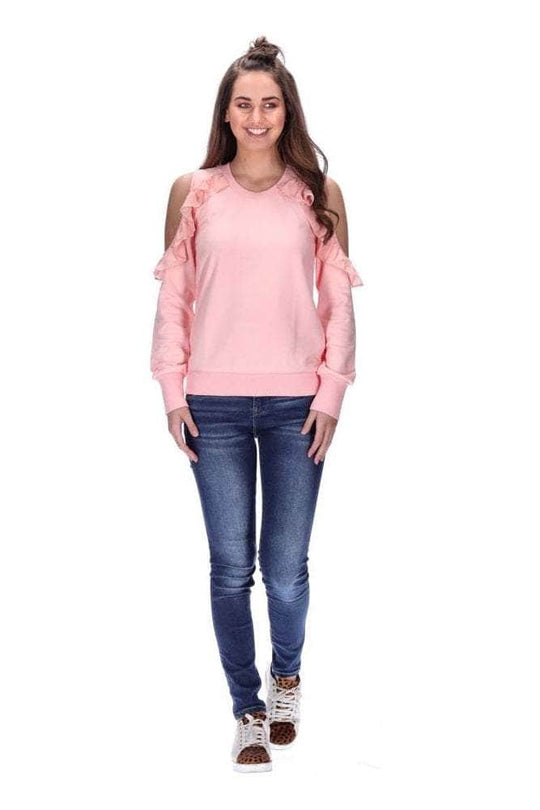 Features: Classic sweater with shoulder cutouts and chiffon ruffles