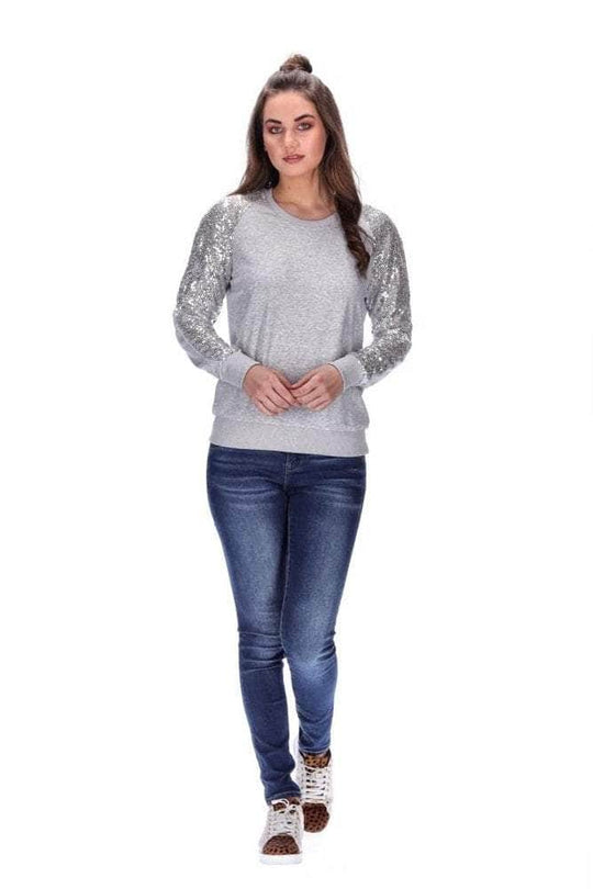 Sweater with raglan seam sleeves, sequin on the front half of sleeves and chunky ribbing on hems