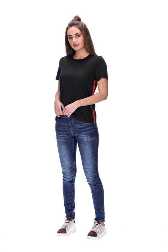 T-Shirt Features: Red and black striped band on the side seams, straight hem