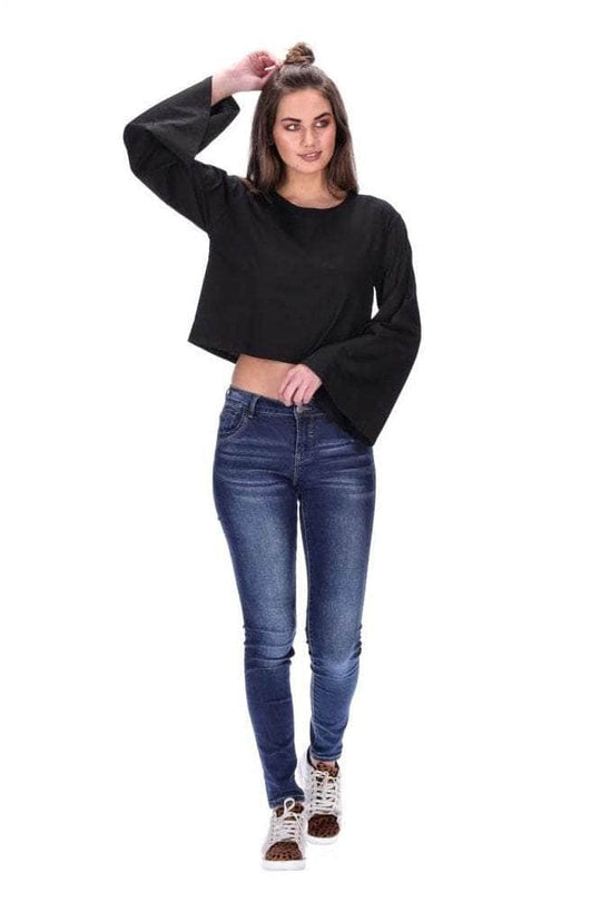 Features: Cropped length with flare long sleeves, self fabric binding and double needle hems
