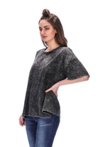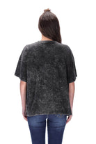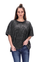 Features: Acid wash look, neck ribbing , straight hemline, short length