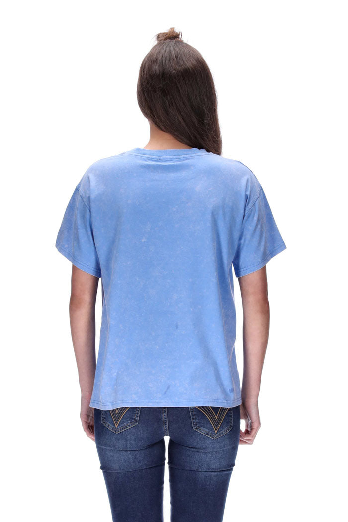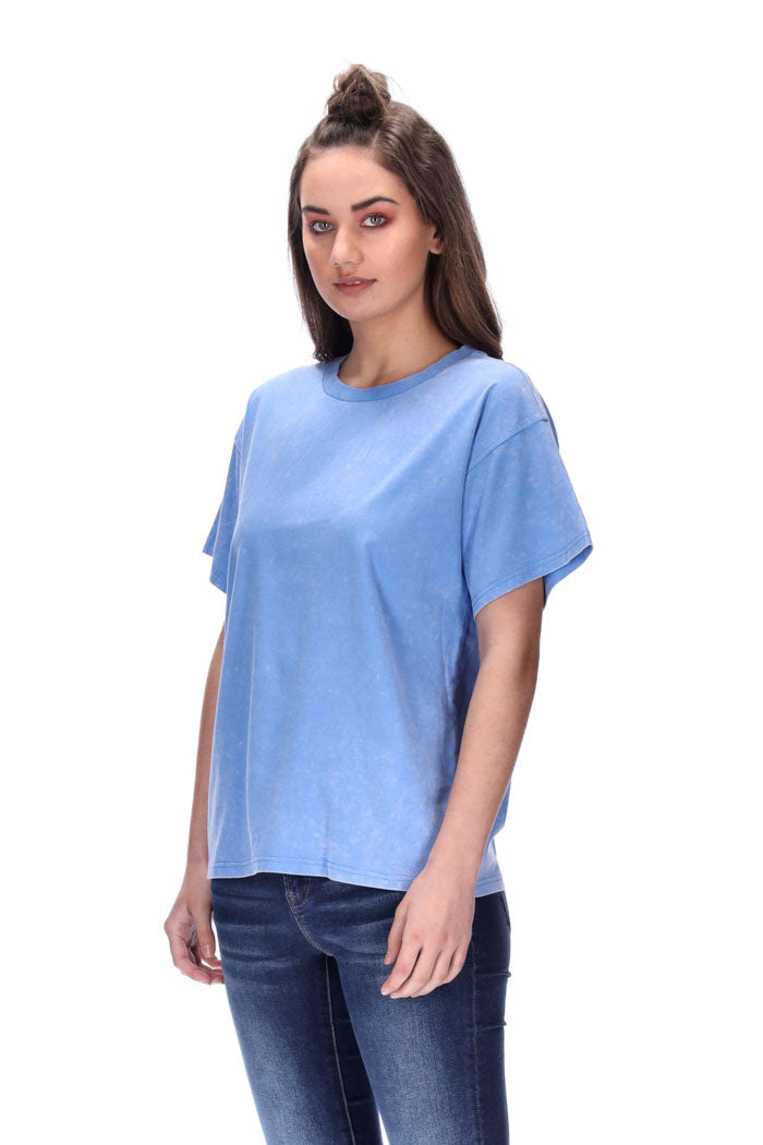 Features: Acid wash look, neck ribbing , straight hemline, short length