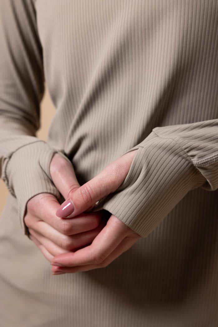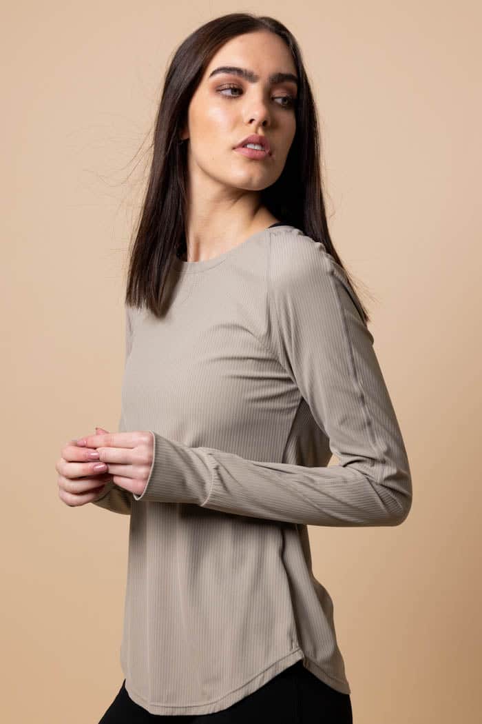 A soft taupe active long sleeve top.