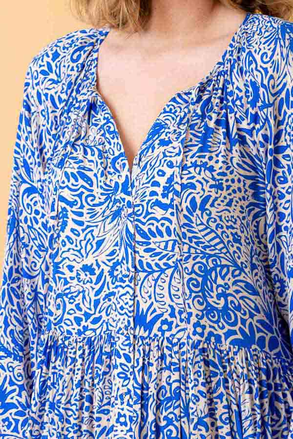 A blue floral print tiered midi dress.