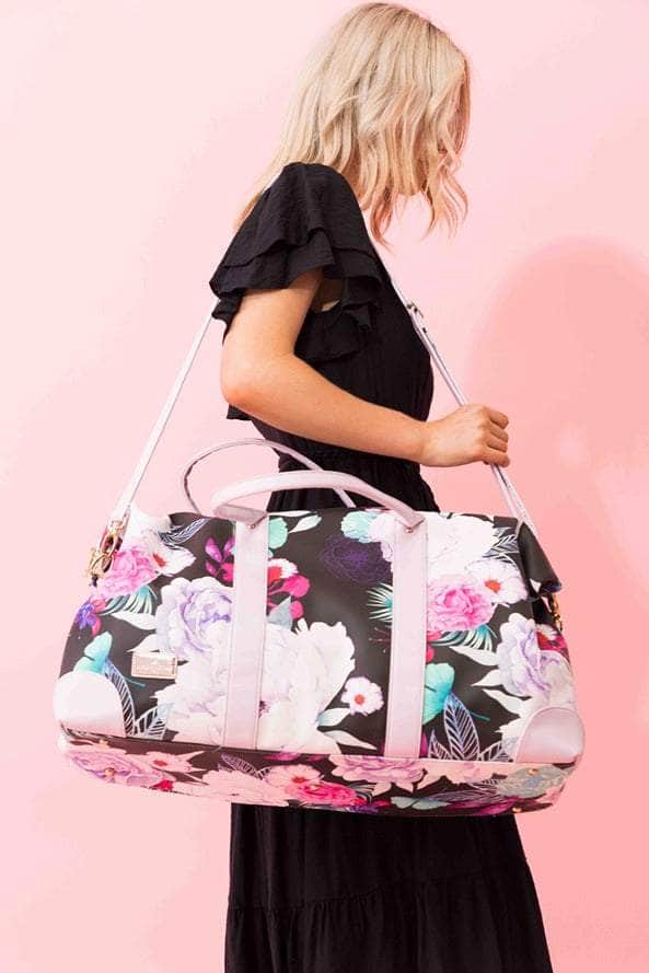 The perfect overnight bag! A black based floral print duffle bag, with light pink handles and shoulder strap.