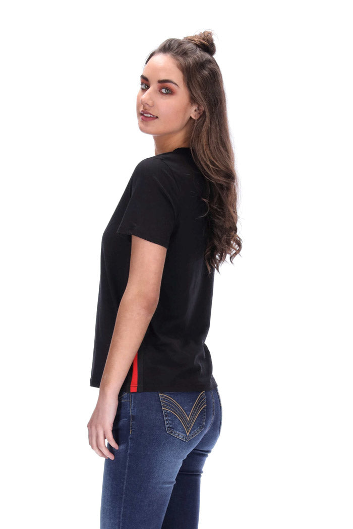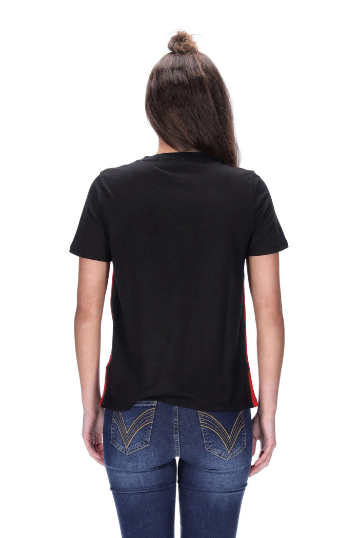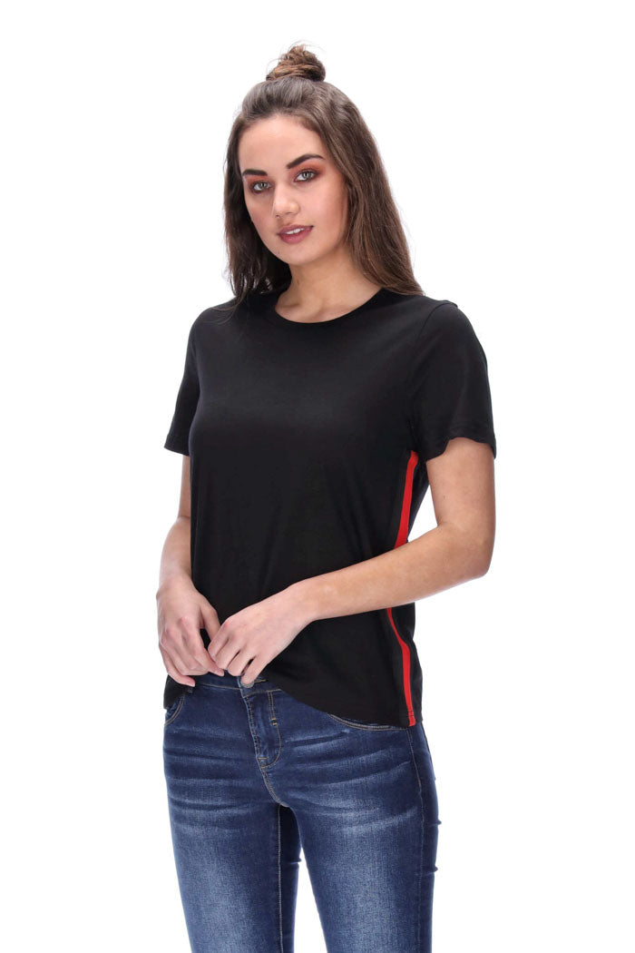 T-Shirt Features: Red and black striped band on the side seams, straight hem