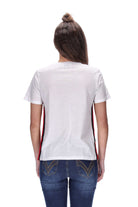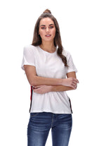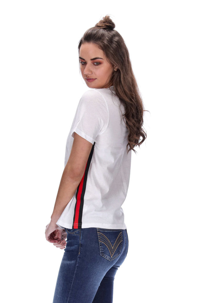 T-Shirt Features: Red and black striped band on the side seams, straight hem
