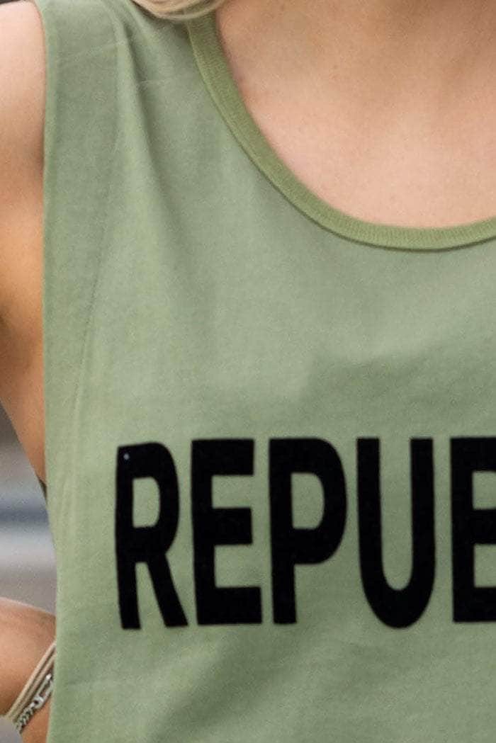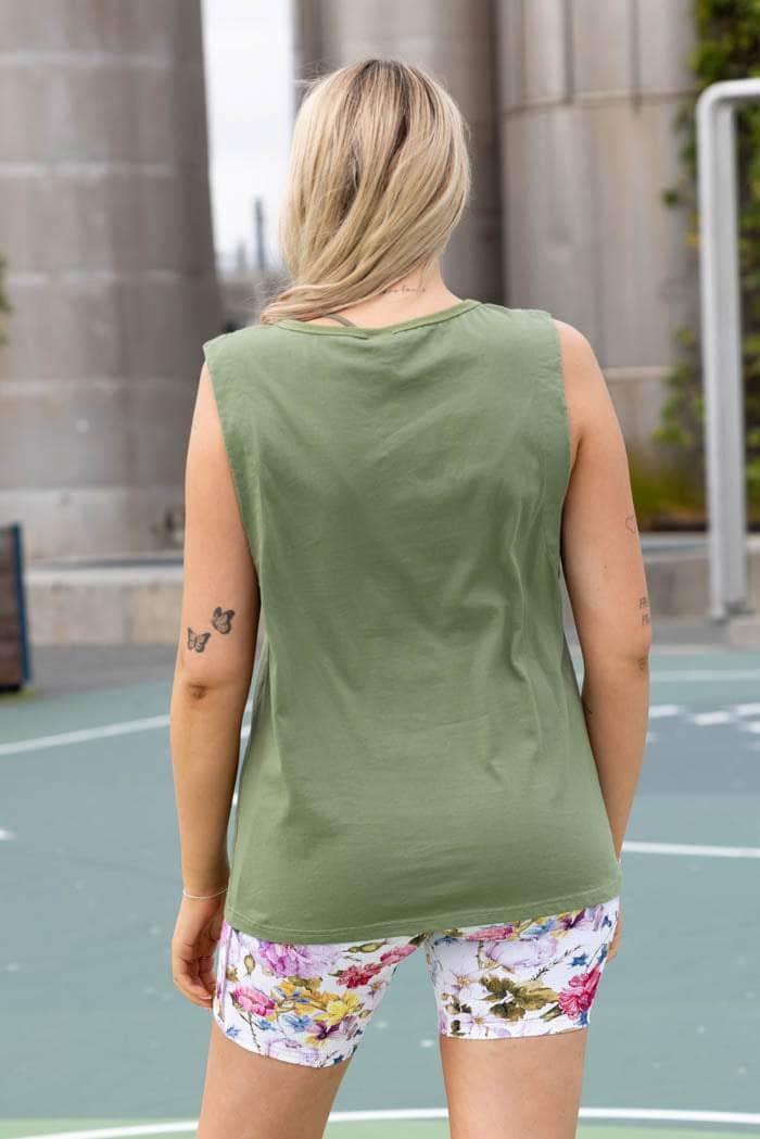 A khaki green tank top with low armholes.